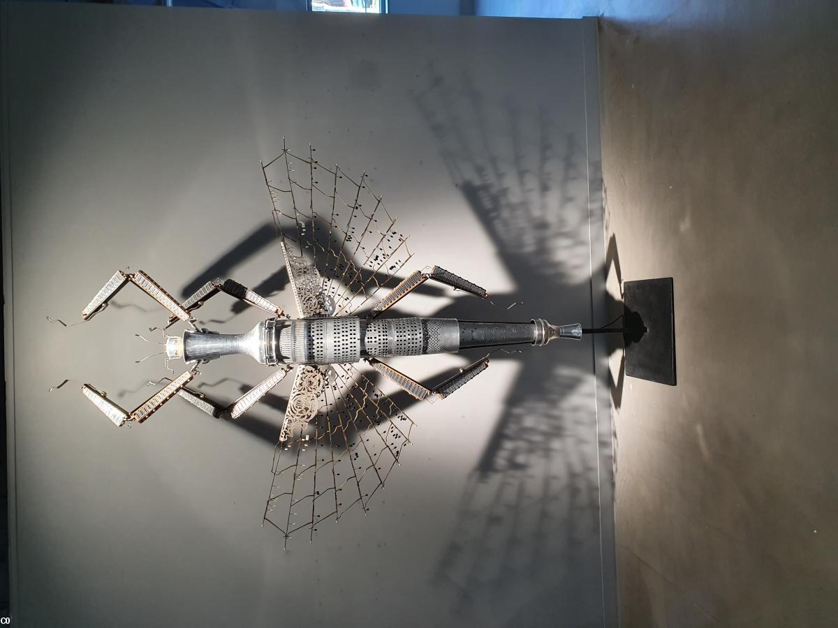 Nous voyageons à la fois dans un milieu minimaliste et gigantesque ; cette transposition d’insectes en œuvres d’art mérite un détour dans sa fabrication : autour de l’atelier ouvert au public, se situant au milieu de l’exposition et permettant de découvrir, d’autre part, toutes sortes d’outils utilisés, de matières, de vis, de charnières, jusqu’au microscope dévoilant ce que l’on ne pourrait percevoir à l’œil nu.