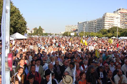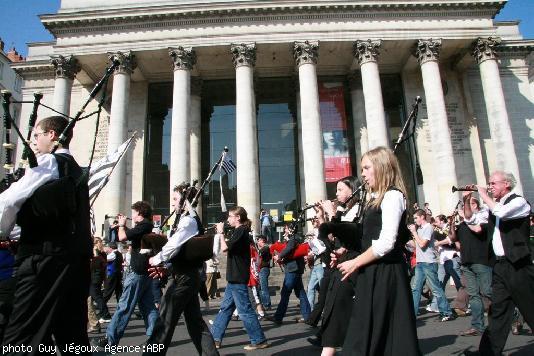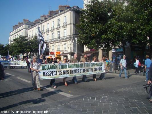 10 000 manifestants ont défilé samedi après-midi dans le centre ville de Nantes pour la réunification administrative des cinq départements bretons, le droit à l'expression de la culture bretonne et pour l'officialisation du breton. Le temps était au beau fixe et l'atmosphère festive pour cette grande parade quasi annuelle de la Bretagne dans son ancienne capitale.
