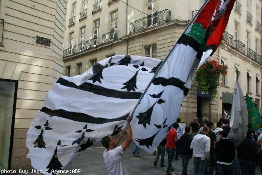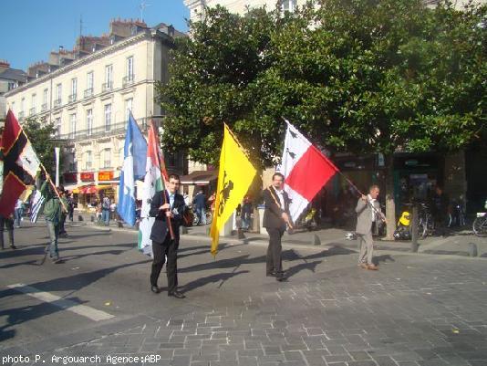 Venus des cinq départements de la Bretagne historique, 10 000 manifestants ont défilé samedi après-midi dans le centre ville de Nantes pour la réunification administrative des cinq départements bretons, le droit à l'expression de la culture bretonne et pour l'officialisation du breton.