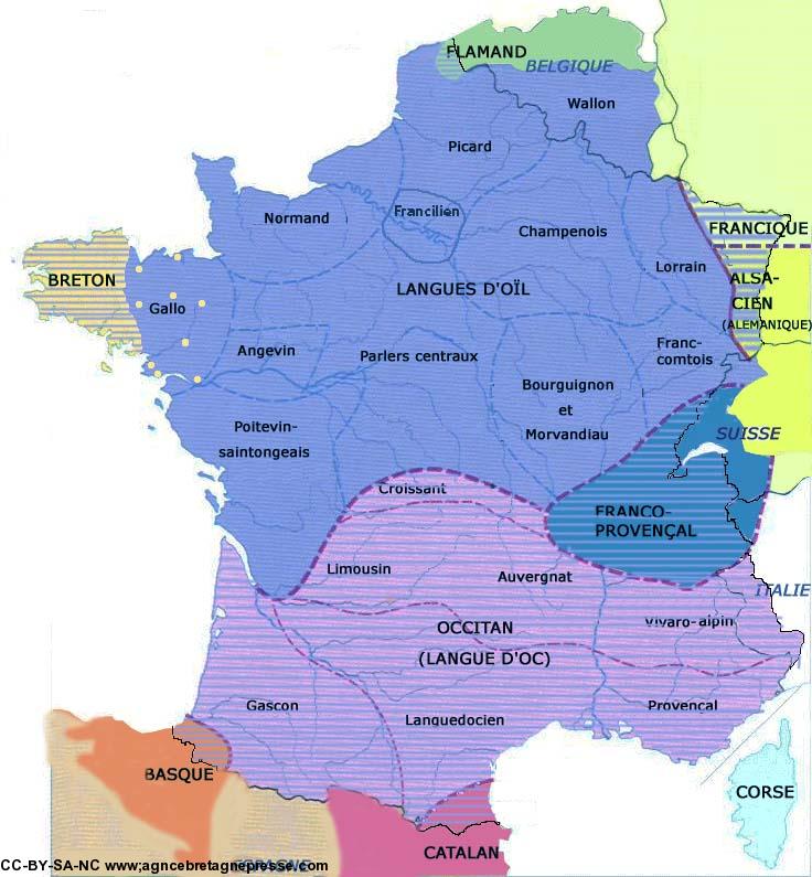 2 ) A remarquer dans la carte que ces découpages, particulièrement en oil et oc, sont totalement arbitraires dans la mesure où, sur plusieurs siècles, il est bien difficile de connaître l’extension véritable et progressive du français et de ces deux dérivés. Que parlait-on auparavant, en Picardie, dans les Alpes, dans le Jura ?