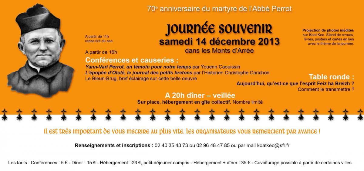 Le 70ième anniversaire du martyre de l'Abbé Yann-Vari Perrot est l'occasion d'un colloque qui aura lieu le samedi 14 Décembre 2013. http://koatkeo.canalblog.com/ mailto:koatkeo@sfr.fr http://emglev.wordpress.com/2013/10/30/sadorn-14-a-viz-kerzu-2014-70vet-deiz-ha-bloaz-yann-vari-perrot-obostol-feiz-ha-breizh/