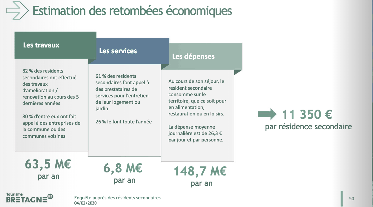 Le Comité régional du Tourisme en Bretagne a pour la première fois commandité une étude sur l'impact des résidences secondaires sur la région . L'étude a porté sur les communes d'Arzon, Carnac, Erquy, Pléneuf-Val-André, Plouguerneau, Roscoff, Saint-Quay-Portrieux, Perros-Guirec, Landéda et Trébeurden. Le drame de la résidentialisation du littoral breton a été traité par plusieurs géographes dont Pierre-Yves Le Rhun et Yves Lebahy dans Géographie et Aménagement de la Bretagne, éditions Skol Vreizh et en 2014 dans la Géographie numérique de la Bretagne . A noter aussi la carte du littoral breton de notre confrère NHU Les chiffres du CRTB sont alarmants puisque le nombre de résidences secondaires extrapolé sur les 5 départements augmente régulièrement. Pour certaines communes du littoral du Morbihan, 80% des habitations sont des résidences secondaires. 60% à Erquy dans les Côtes d'Armor. Le principal problème que ne semblent pas pourtant révéler les réponses aux questionnaires envoyés par Calaméo, est l'inaccessibilité à la propriété de jeunes Bretons dont les parents et grand-parents habitaient sur le littoral depuis la nuit des temps. On sait par exemple que des marins pêcheurs doivent faire plusieurs dizaines de kilomètres pour rentrer chez eux loin dans les terres. La seule consolation pour les communes du littoral sont les retombées économiques. Ce sont, selon cette étude, 11 350 euros dépensés chaque année en moyenne par les heureux propriétaires de ces résidences. Il s'agit de travaux, de services d'entretien, de gardiennage, de l'alimentation et autres dépenses de séjour. Des séjours qui, malgré tout, sont bien plus qu'un mois par an. L'étude parle d'une moyenne d'occupation de 93 jours par an, 3 mois en moyenne. Les résidences sont aussi occupées par les amis, les enfants et parfois autres familles apparentées. Cet apport fait vivre des milliers de petits artisans tout au long de l'année car les réparations et l'entretien se font souvent hors saison. Pour la restauration et l'alimentation c'est une autre histoire, elle a du s'adapter aux rythmes saisonniers. Beaucoup de petits commerçants ont dû fermer les portes au profit des grandes surfaces par manque de clientèle l'hiver.Pour les populations locales, ces retombées ne sont que bien relatives. En fait, l’économie de villégiature introduit un système de société duale très déséquilibré où extrême richesse et extrême pauvreté se côtoient tout en s’excluant.__Yves Lebahy in Géographie numérique de la BretagnePeut-on parler de remplacement de population ? Apparemment oui puisque selon l'étude, seulement 28% des propriétaires de résidences secondaires sont Bretons (chiffre extrapolé sur les 5 départements). Mais ce chiffre n'est pas forcement exact si l'on observe que beaucoup de propriétaires de résidences secondaires en Bretagne venant de la région parisienne ont des origines bretonnes.