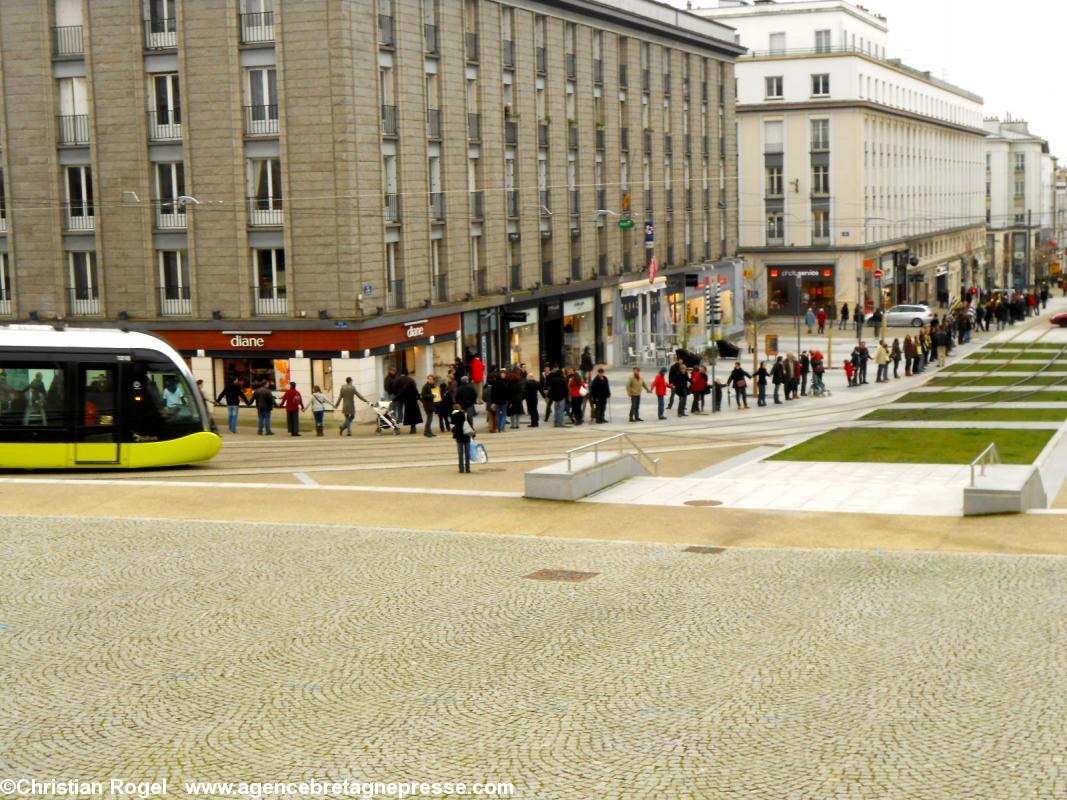 Il était ensuite proposé à l'assistance de former une chaîne menée par une personne arborant un panneau indicateur qui disait en breton « Du breton dans la télé, du breton dans votre bouche » (brezhoneg 'barzh an tele / brezhoneg en ho peg). La chaîne humaine est partie de la rue Frédéric Le Guyader, derrière le Quartz, où se trouve France 3 Iroise, siège et lieu de production pour la Bretagne Ouest de France 3, puis descendit la rue de Siam jusqu'à la Rue Jean Macé, puis partit dans l'autre sens pour longer la Place la Liberté et passer devant l'Hôtel de Ville, avant de former une immense ronde qui suivait les limites de la grande esplanade pavée.