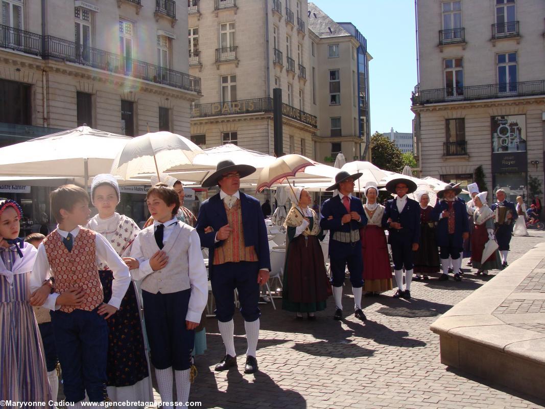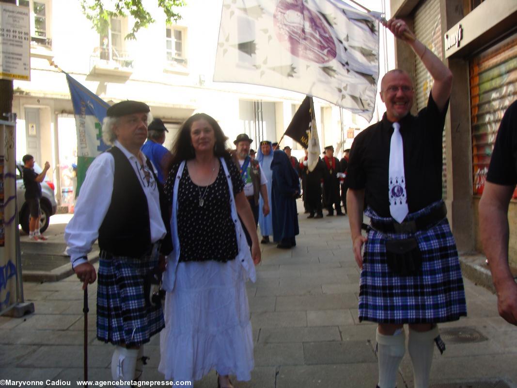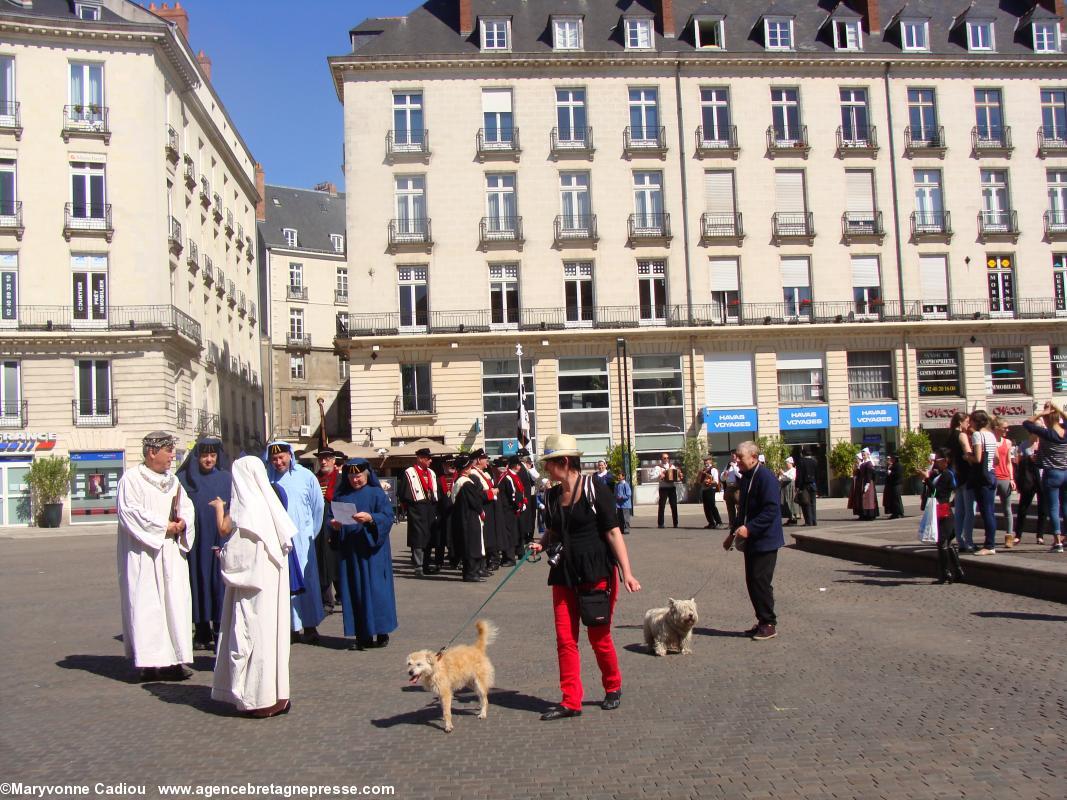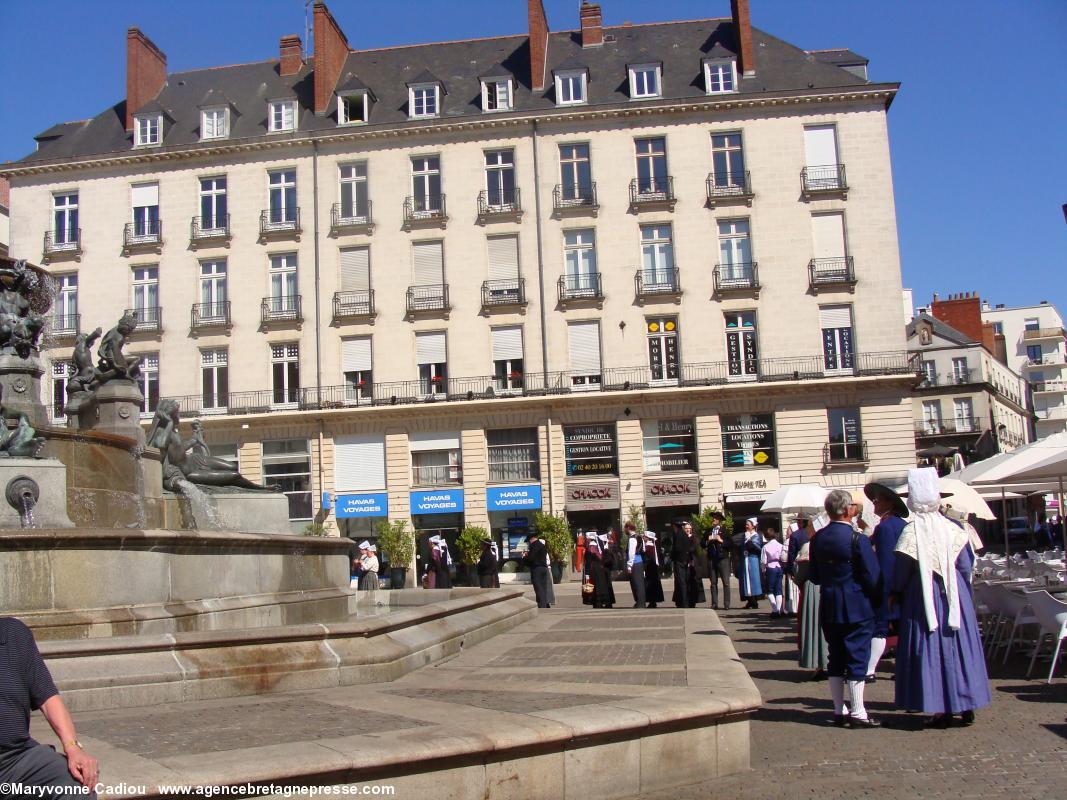 Sur le parcours, des badauds s'interrogent. Des hommes en kilts ? Des druides ? À quelle occasion ? Et voila un petit peu de pub à bon compte. Le soleil commence à taper, et devant la fontaine de la place Royale, le président du Comité des Vins bretons s'interroge sur l'idée d'y remplacer l'eau par du Muscadet !