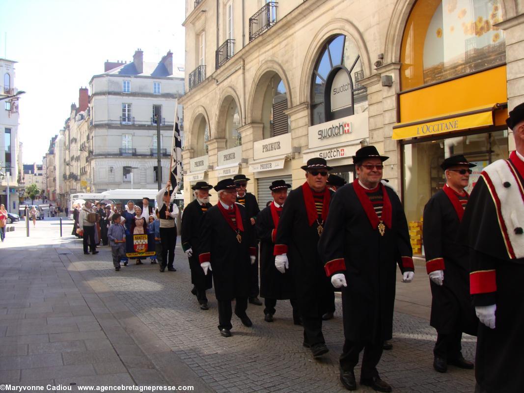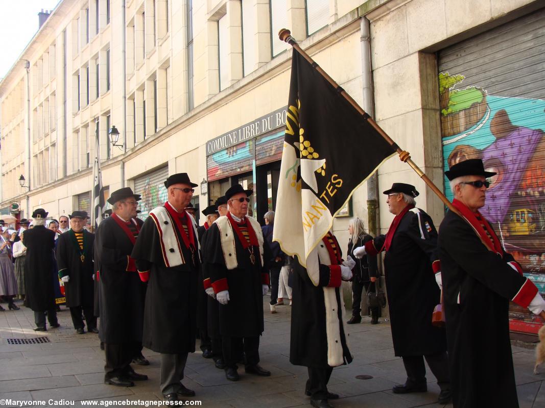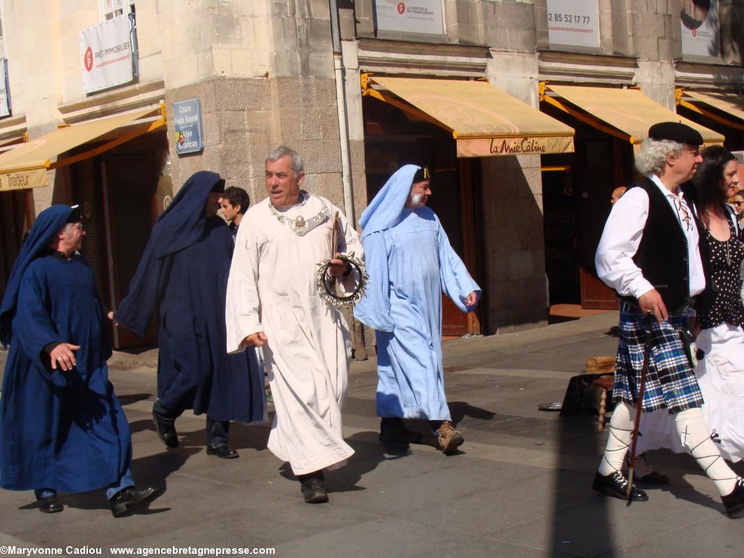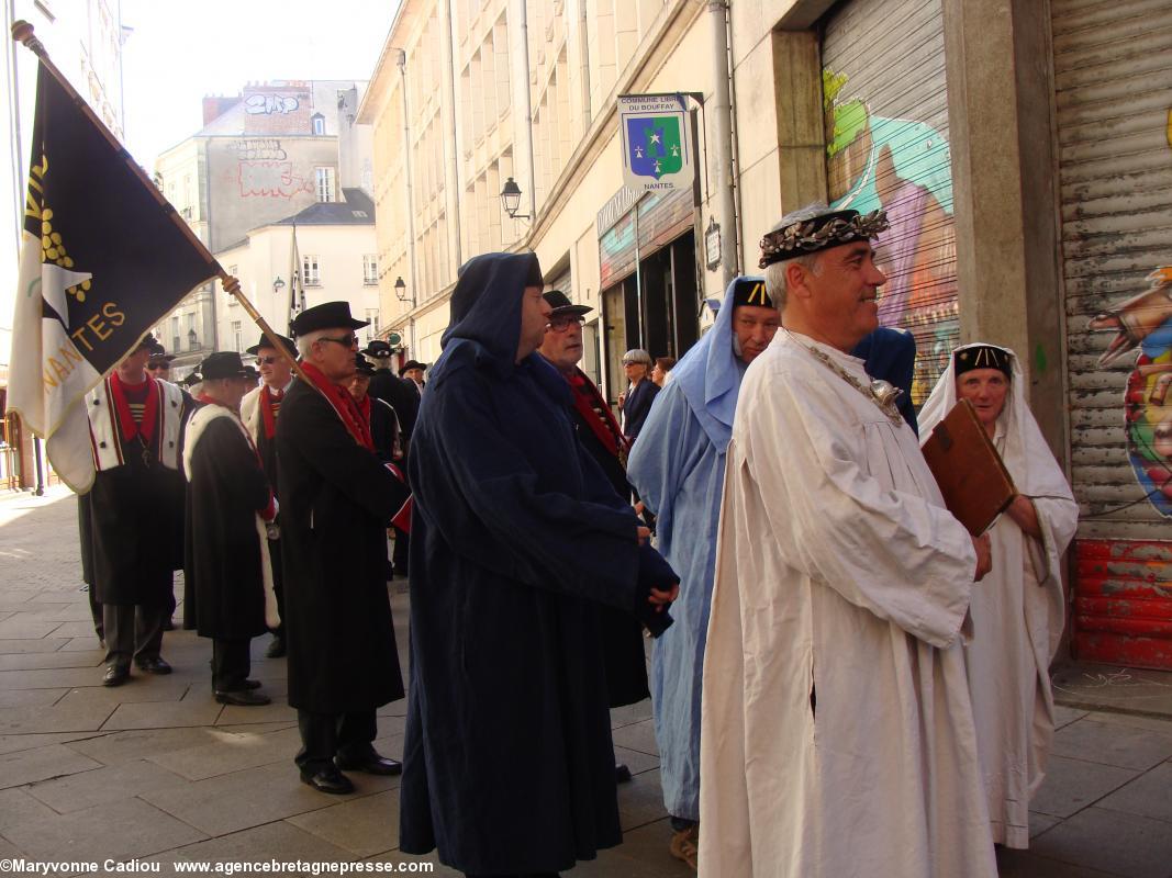 Juste derrière, des druides, de la Gorsedd http://www.gorsedd.fr/, dont le Grand druide Morgan. Puis avance la fameuse confrérie des Bretvins http://www.bretvins.com/, à sa tête son Grand Maître. Elle a fière allure. Suivent les représentants de la Commune libre du Bouffay, et son joyeux Gouverneur maire. Derrière tout ce beau monde, une autre facette de la culture : le fameux cercle celtique Tréteau & Terroir http://www.treteau.net/ et le groupe de chanteurs de chants de marins et de mariniers Vent de Galerne http://www.treteau.net/index.php?option=com_content&view=category&layout=blog&id=38&Itemid=69. Enfin, un groupe du pays voisin : Les Amis du Vieux-Poitou, le groupe invité cette année http://amis.vieux.poitou.pagespro-orange.fr/accueil.htm.