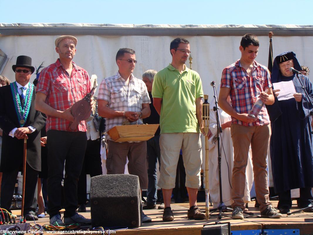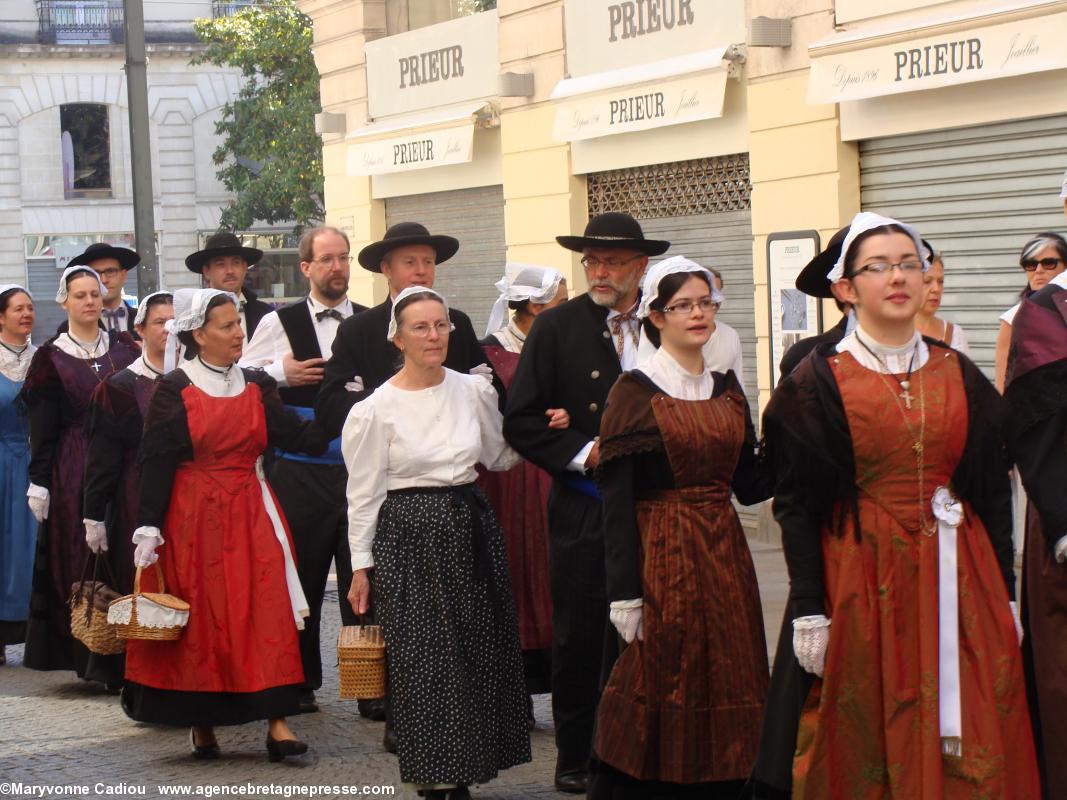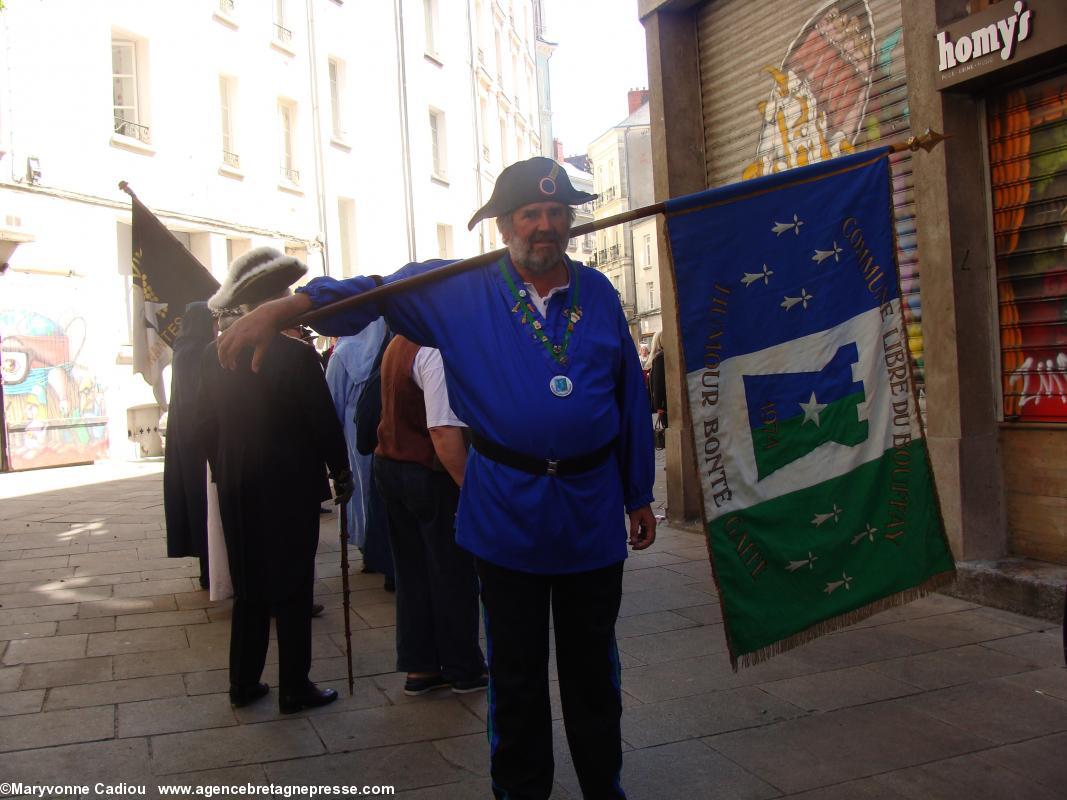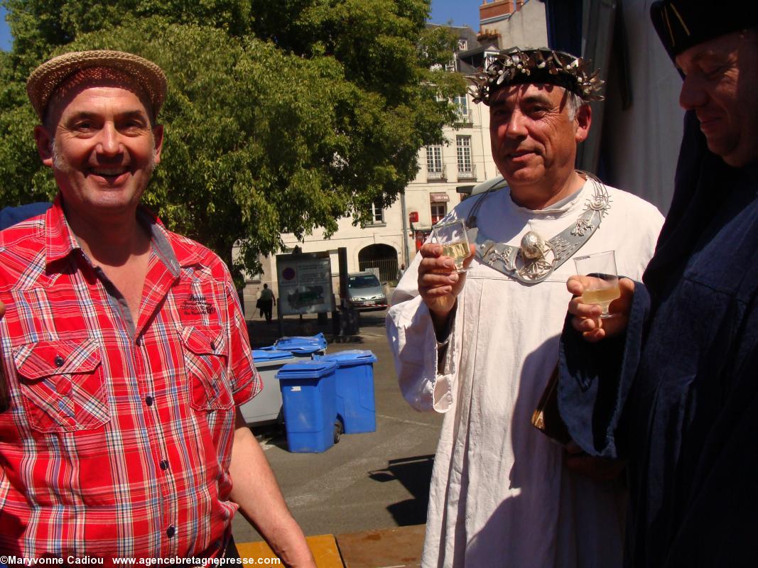 Juste derrière, des druides, de la Gorsedd http://www.gorsedd.fr/, dont le Grand druide Morgan. Puis avance la fameuse confrérie des Bretvins http://www.bretvins.com/, à sa tête son Grand Maître. Elle a fière allure. Suivent les représentants de la Commune libre du Bouffay, et son joyeux Gouverneur maire. Derrière tout ce beau monde, une autre facette de la culture : le fameux cercle celtique Tréteau & Terroir http://www.treteau.net/ et le groupe de chanteurs de chants de marins et de mariniers Vent de Galerne http://www.treteau.net/index.php?option=com_content&view=category&layout=blog&id=38&Itemid=69. Enfin, un groupe du pays voisin : Les Amis du Vieux-Poitou, le groupe invité cette année http://amis.vieux.poitou.pagespro-orange.fr/accueil.htm.