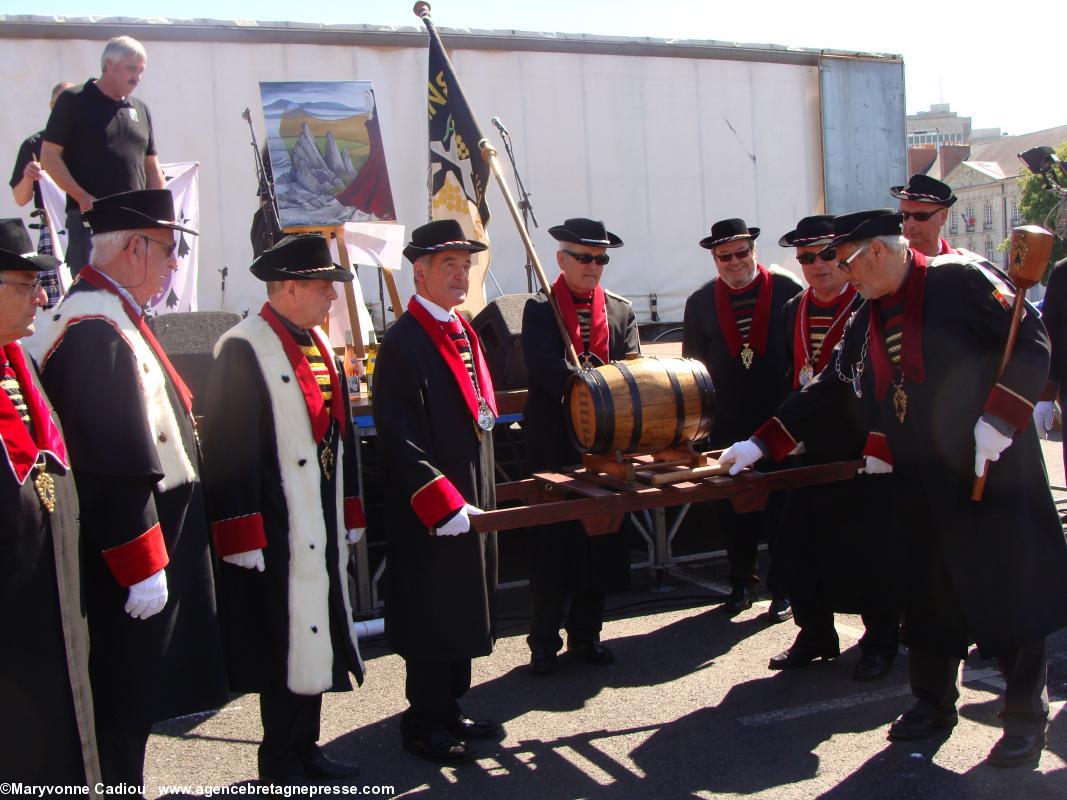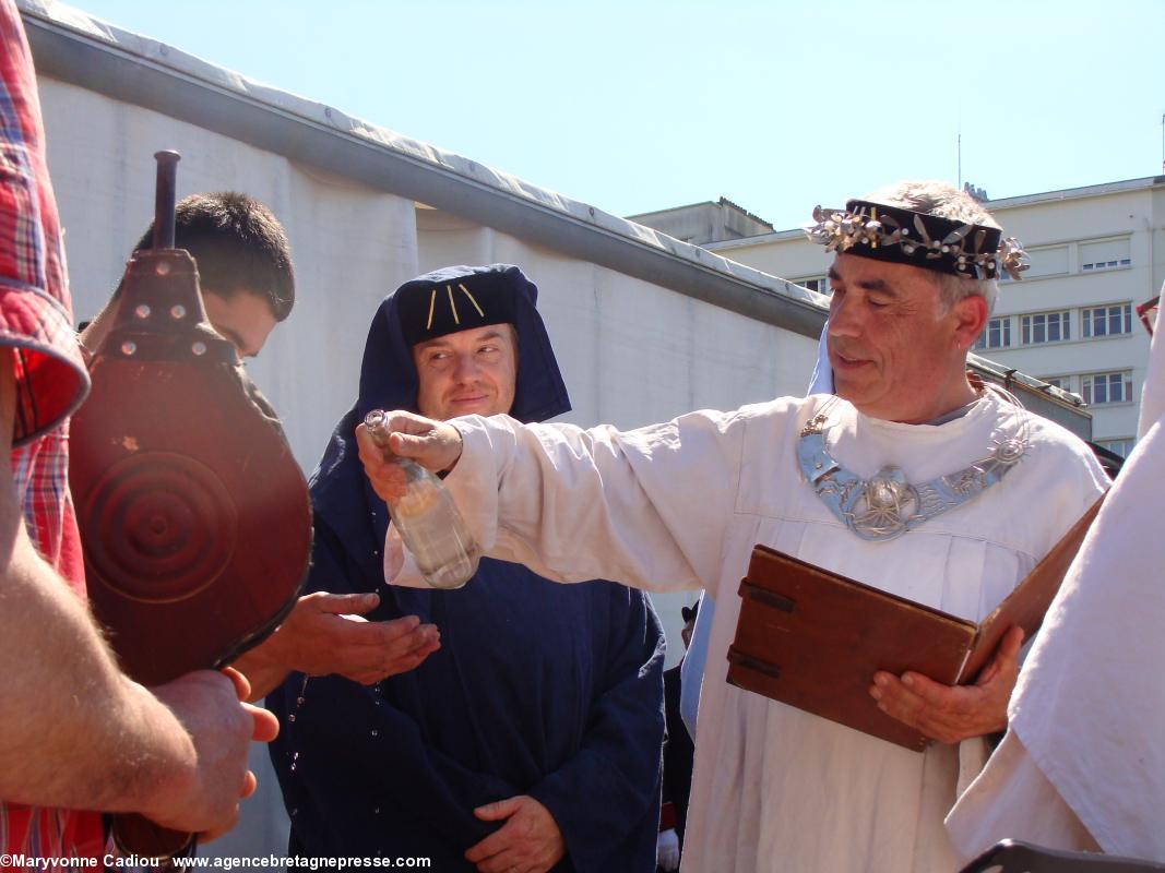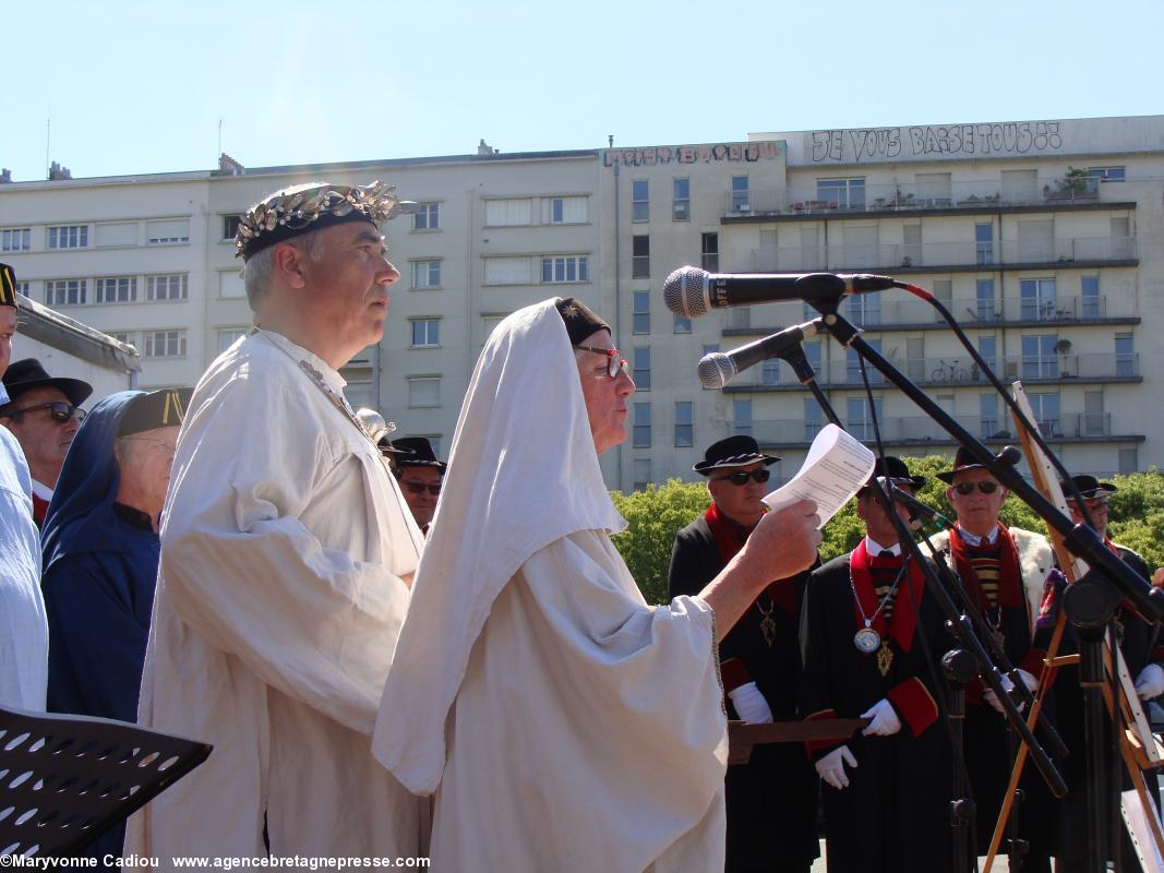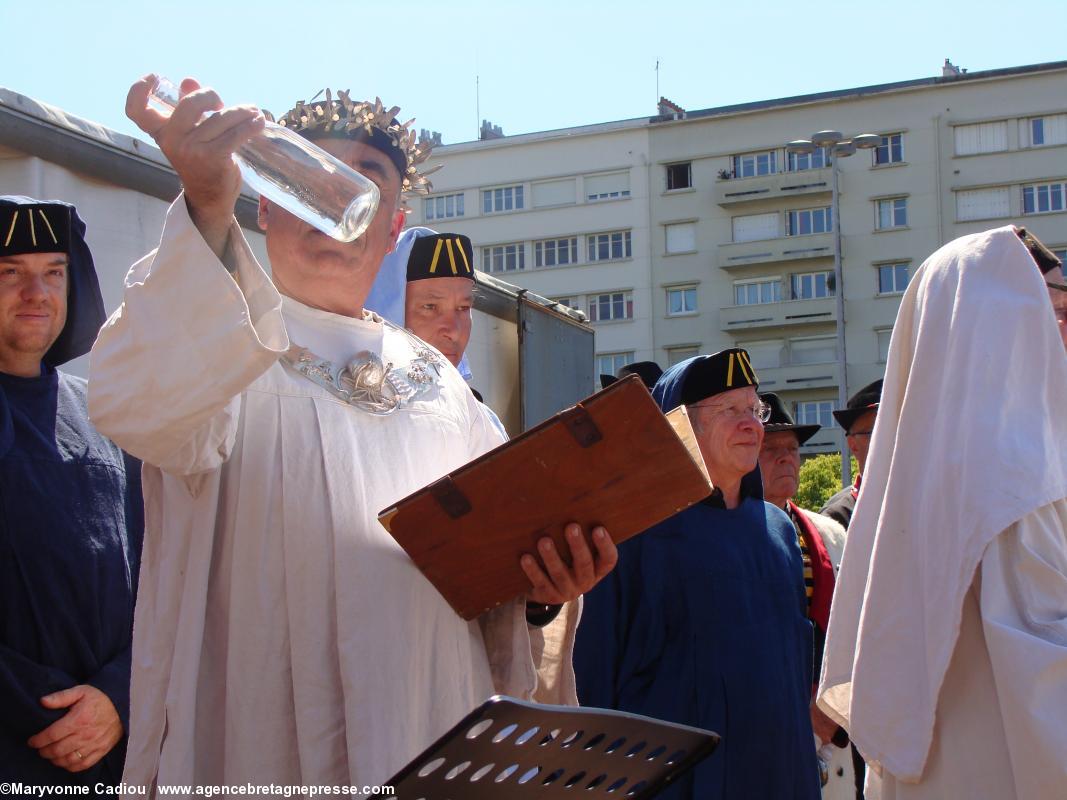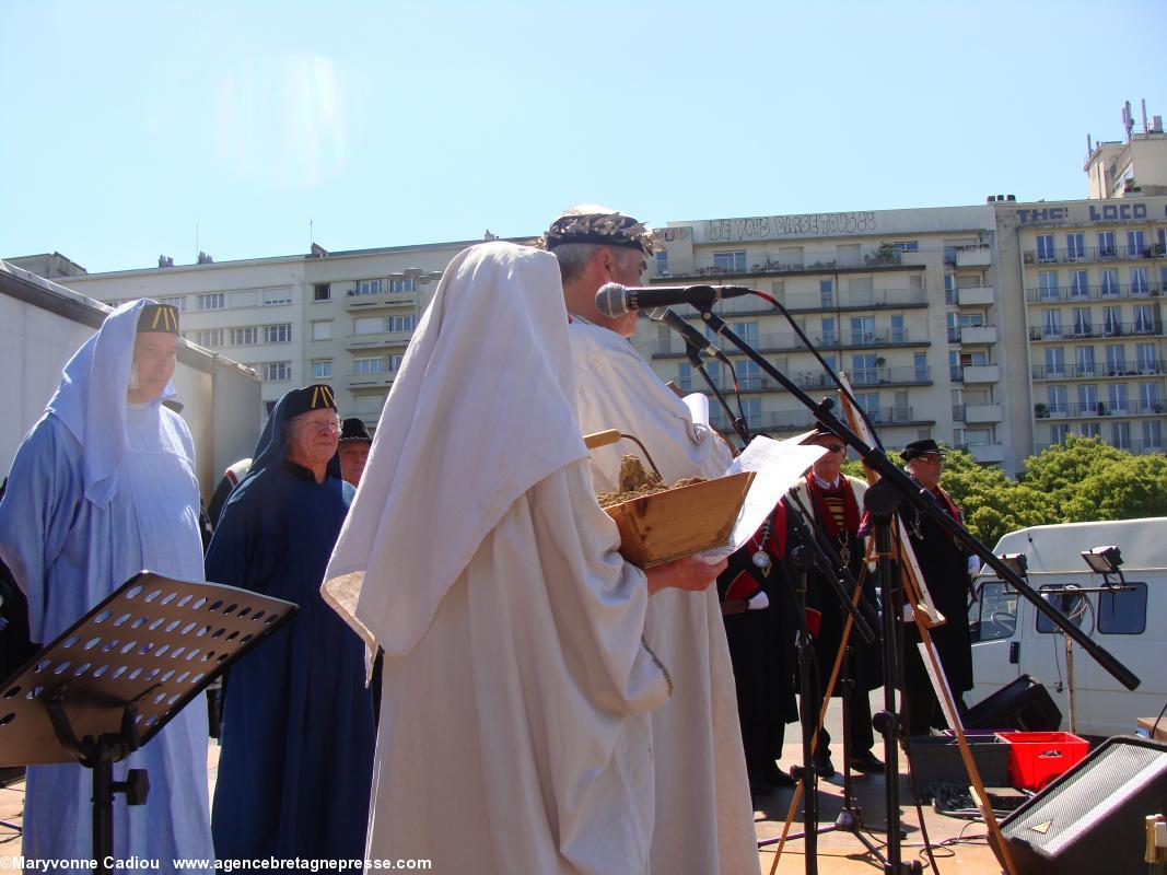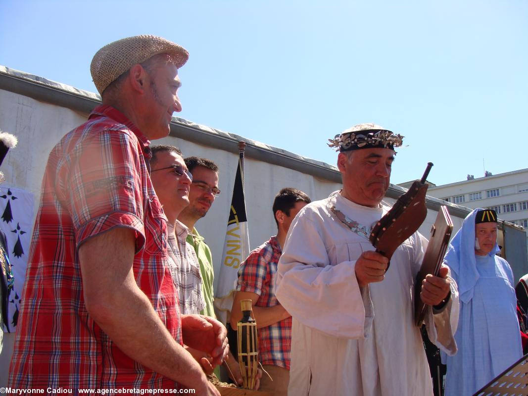 Après un intermède que nous qualifierons de joyeux, avec les prestations en chanson des membres de la Commune libre du Bouffay (1), puis par la cérémonie des Chevaliers Bretvins autour de leur tonneau de muscadet, vient le moment sacré du symbole et du rite (PDF 3). " J'appelle le souffle de l'Inspiration et avec lui l'Eau, le Feu, la Terre et le Vent. Ici à Nantes en compagnie des habiles acteurs du vin, je demande aux forces de l'Univers de nous rejoindre comme témoins, assistance et protection ". Tour à tour, les quatre vignerons du Comité des Vins Bretons viendront chacun avec un des quatre éléments. Maxime Chéneau : l'eau http://www.muscadetcheneau.com/ " L'eau [qui] court l'âme des choses " ; Édouard Massard : le feu http://www.vigneron-independant.com/annuaire.php?page_annu=oenotourisme&numadh=5263 " Le feu du Soleil [qui] apporte le changement aux choses " ; Emmanuel Audrain : la terre http://www.domaine-bel-air-audrain.com/ " La Terre [qui] est l'horizon où toute chose devient vraie " ; Jean-Michel Poiron-Dabin : l'air http://www.muscadetcheneau.com/ " Le Vent [qui] nourrit l'Esprit ".Le Grand druide conclut, parlant du vin " Que le liquide miraculeux né dans la joie soit bon ! Qu'il soit bon pour les Hommes et leur donne du coeur et des rêves ! Sous le Soleil oeil de Lumière Qu'il soit bon pour tous ! Qu'il soit bon pour tous ! Qu'il soit bon pour tous !"