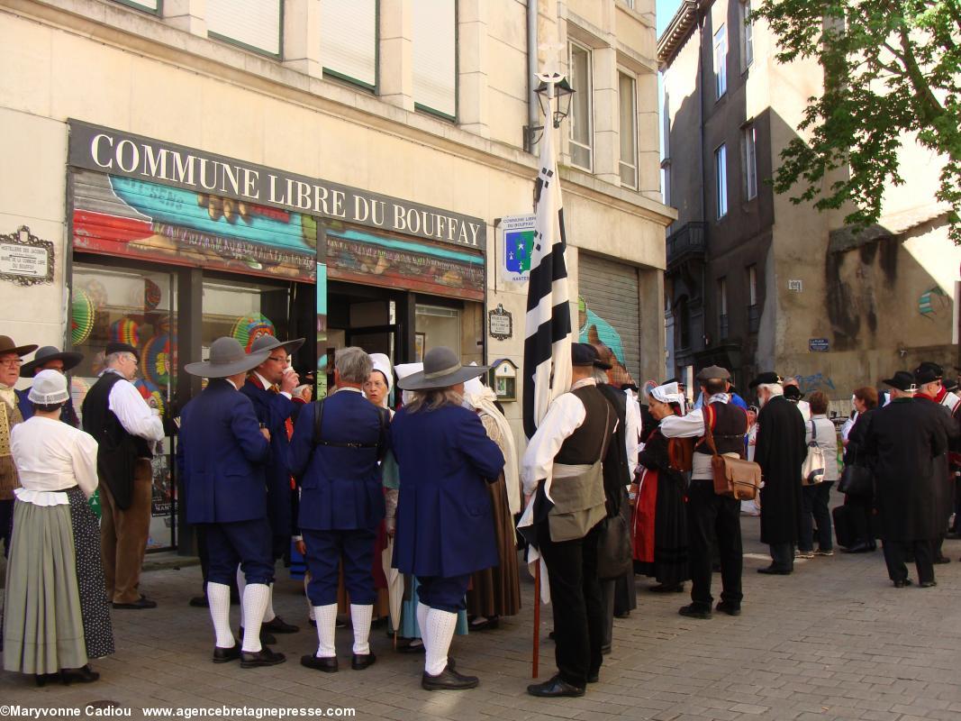 - Rassemblement devant la Commune libre du Bouffay. En somptueuses vestes bleues et chapeaux gris, des Amis du Vieux Poitou.