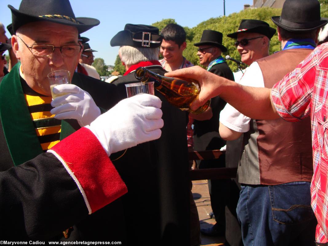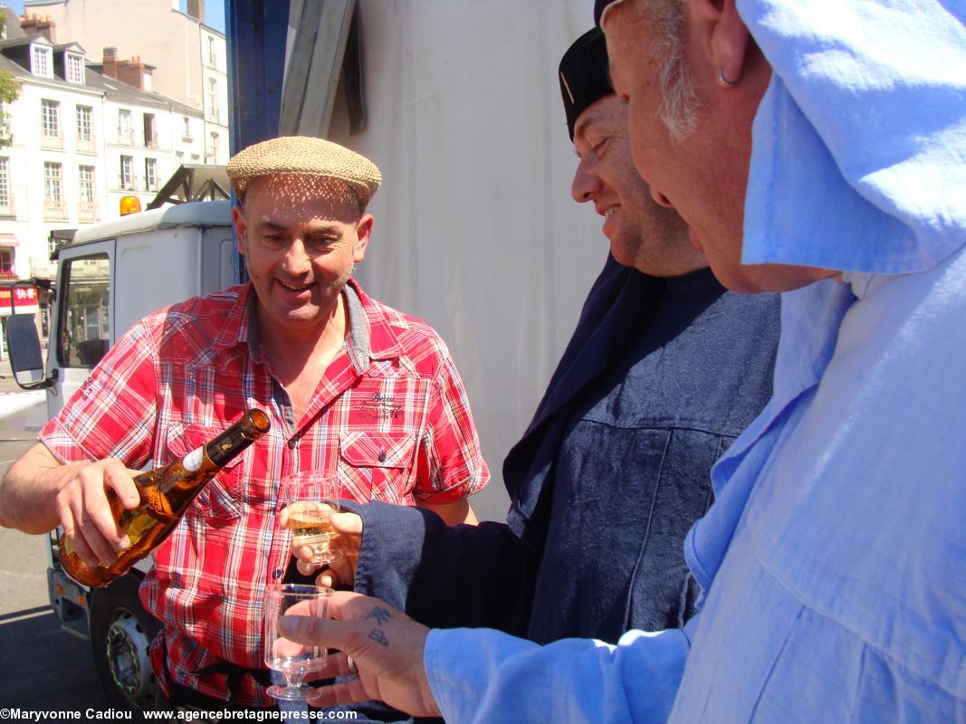 - On trinque en bas de la scène. Jean-Michel Poiron-Dabin sert les Bretvins. Au fond Maxime Chéneau fait de même. Il est temps d'aller déjeuner. Photos de la fête à suivre dans un autre article.