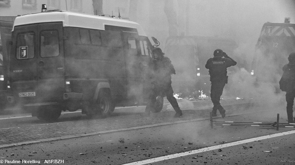 Vers 18 heures, alors qu'il ne restait sur place que les éléments les plus radicaux, des affrontements ont eu lieu place de l'Hôtel de ville et place Aristide Briand. Partis ensuite vers la gare, un petit groupe manifestants, qui avaient allumé des feux de rue et dressé des barricades, ont été dispersés. Le LBD40 (lanceur de balles en caoutchouc) a été utilisé à cette occasion. Il y a eu trois interpellations. Des manifestants ont reçu des flashballs dans les jambes et une manifestante aurait eu le coude fracturé par un tir de flashball. Plusieurs personnes auraient été hospitalisées. Nouveau : des policiers ont arraché des gwenn-ha-du des mains de manifestants.