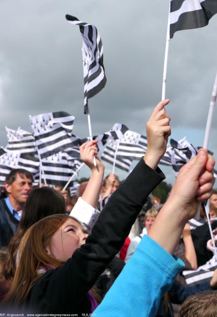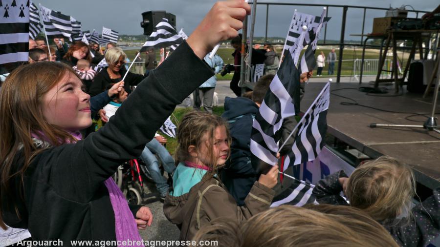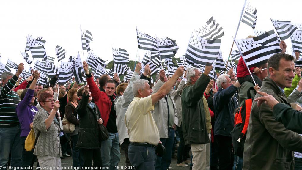 À quelques centaines de mètres du rassemblement écologiste au Cap Coz [ABP23218], le collectif "Pour une Cornouaille vivante et dynamique", créé par des agriculteurs et des acteurs du monde économique, des artisans, des pêcheurs et des commerçants, a réuni un millier de personnes, 1.500 selon les organisateurs, sous la bannière de "Pour une Bretagne unie". 800 Gwenn ha Du avaient été distribués pour signifier cette unité bretonne et le refus de voir la Bretagne se diviser sur des intérêts économiques divergents.