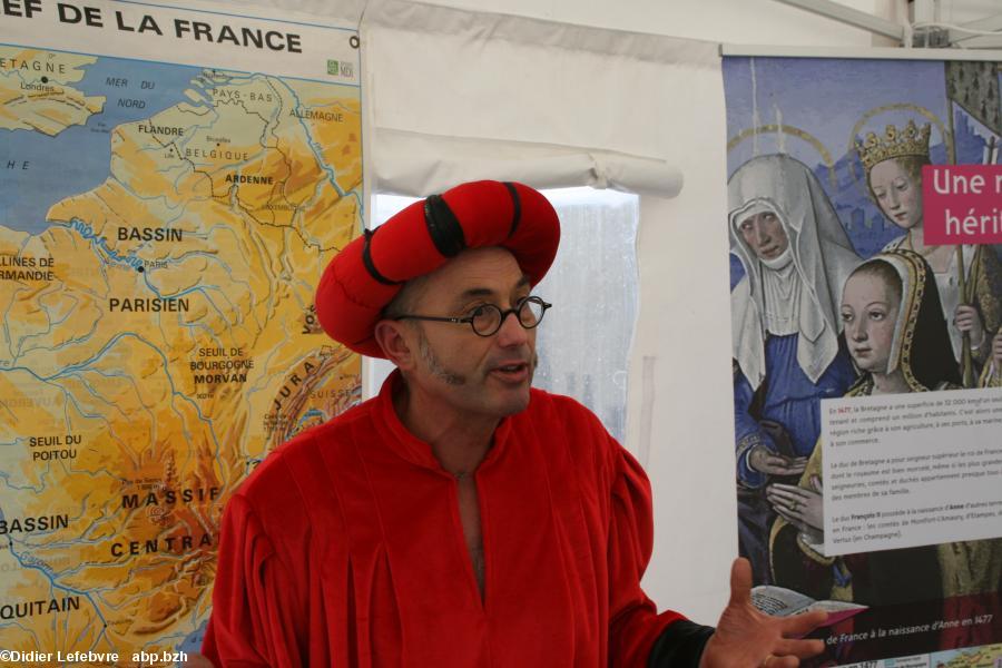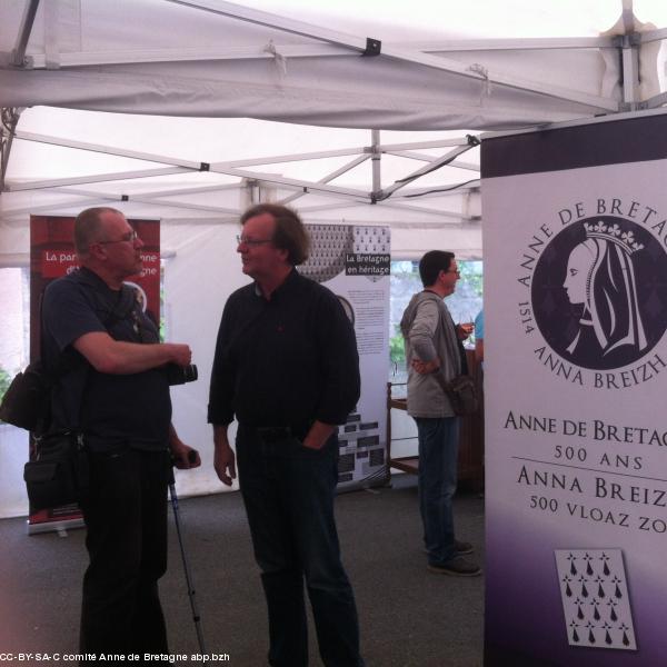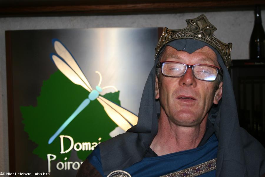 Dans une ambiance très décontractée, nous fûmes donc accueillis dans ce domaine pour une dégustation, où se mêlaient aussi rappels historiques et géographiques. François II, d'abord, et sans peine nous reconnaissons Jean-Michel. Sans arrêt, petits groupes par petits groupes, il rappelle l'histoire du Berligou à travers les siècles, jouant d'effets scéniques et de bons mots, alliant une partie théâtrale, une autre professorale. On sent aussi le connaisseur et le viticulteur de talent. Plus loin, dans la cave, religieusement, Charles le Téméraire – c'est Laurent, le frère et associé de l'EARL – officie. Il nous présente toute la gamme des vins proposés et s'attarde sur la signification de l'emblème du domaine, la libellule. Il s'agit d'un animal indicateur de la bonne santé bioécologique des milieux, elle est donc tout à son aise sur le domaine des Poiron-Dabin, où, entre autres, le Berligou ne subit pas les excès de produits chimiques. Les " CMR ", redoutables produits chimiques, sont utilisés avec la plus grande parcimonie. Laurent nous explique d'une part qu'elle est très présente, grâce à des points d'eau à différents endroits du domaine, ensuite qu' " elle est tout à l'image de nos vins : alliant finesse, équilibre et couleurs délicates ". Entre François II Charles et Charles le Téméraire, la duchesse Anne et sa dame de compagnie (respectivement la fille et l'épouse de Jean-Michel) nous font grâce de tous leurs sourires, accueillent et accompagnent les visiteurs.Le comité Anne de Bretagne et l'Institut culturel de Bretagne toujours présents