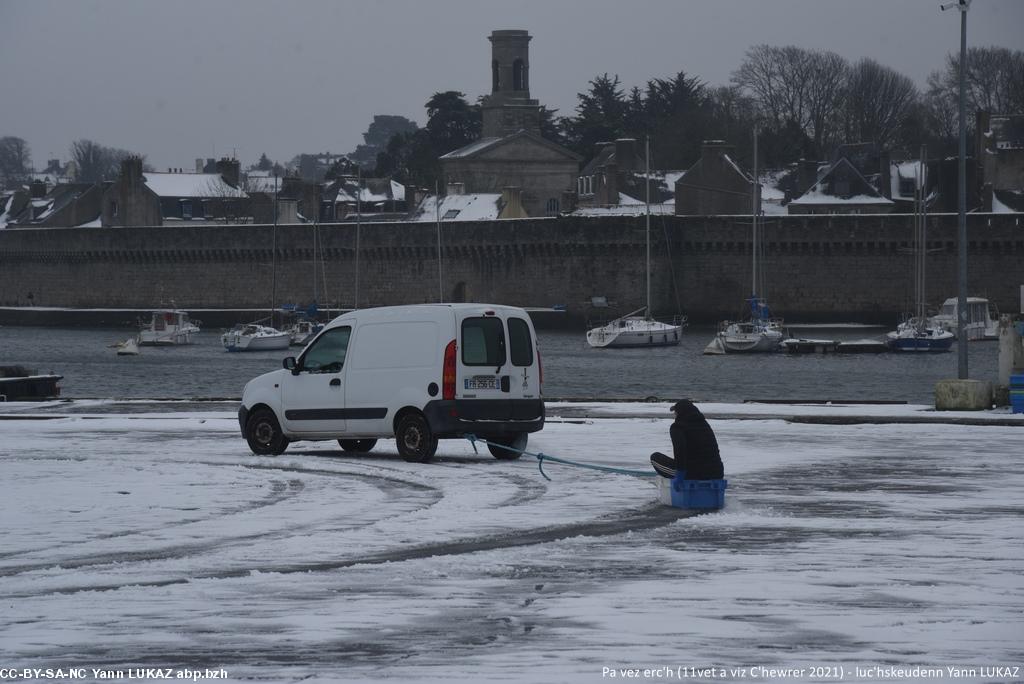 - Konk-Kerne, ar porzh. Ur c'hoari nevez: risklañ a-dreñv d'ur c'harr-tan Concarneau, jeu de circonstances: une luge tractée improvisée.