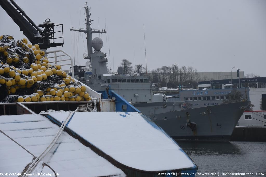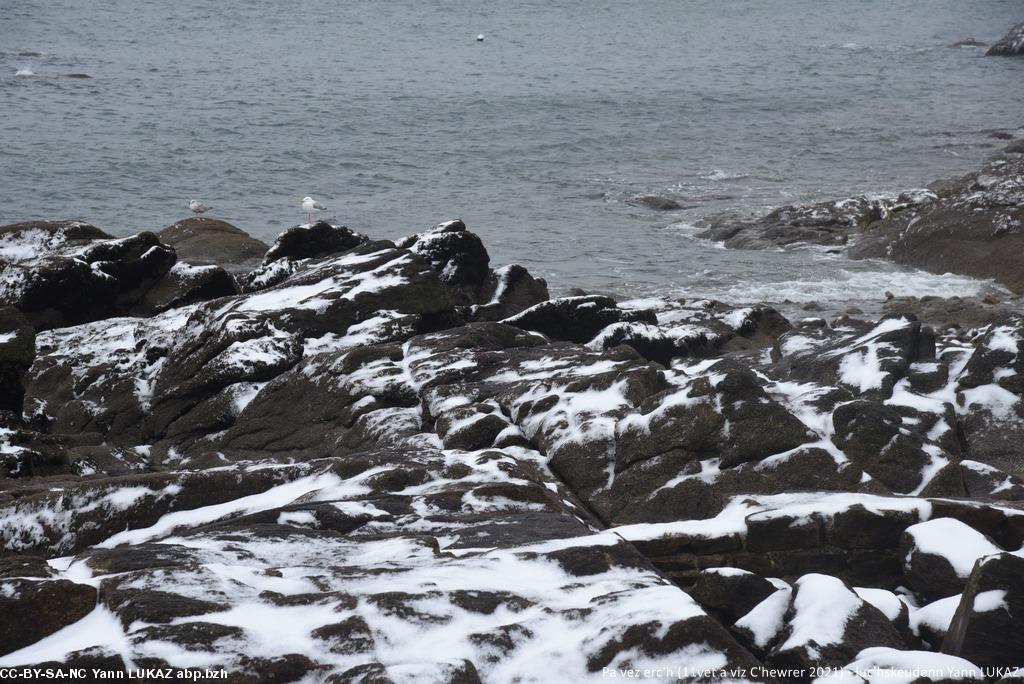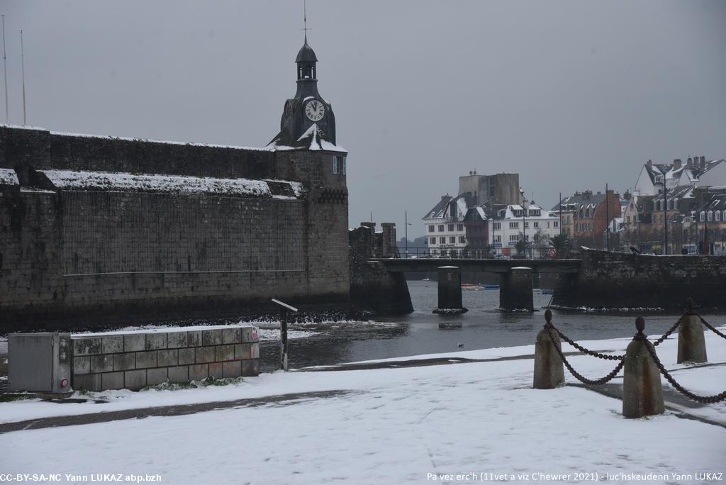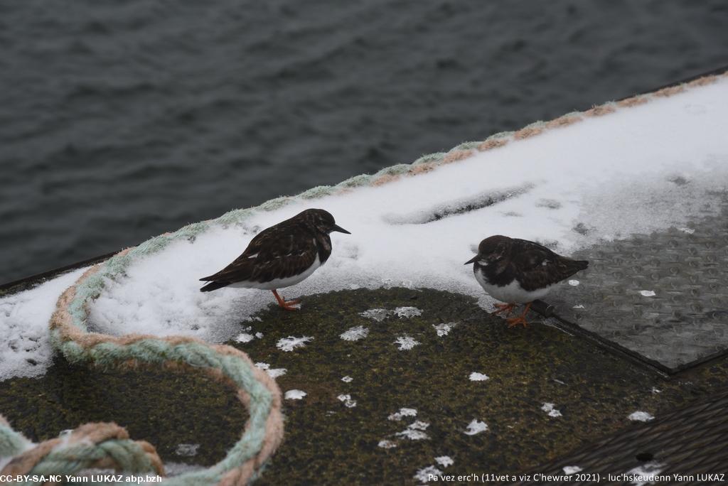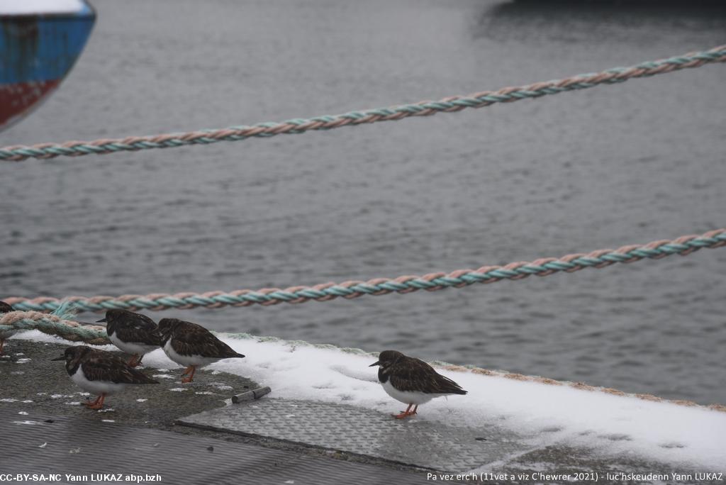 - Konk-Kerne, ar porzh. Ur rummad a Noueliged (Charadrius hiaticula, añv skiantel e latineg).Concarneau, le port. Gravelots, familiers et décontenancés par un élément inconnu: la neige.