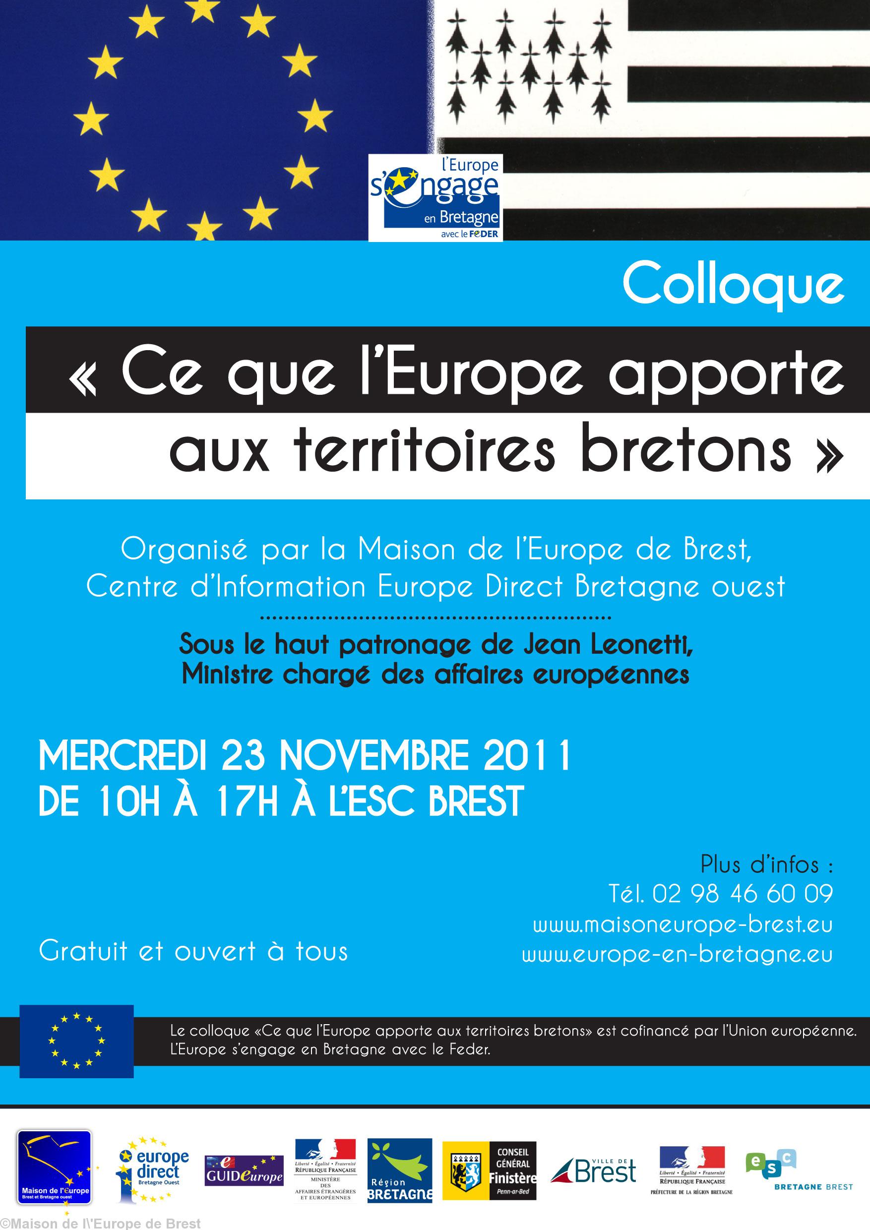 La Maison de l'Europe de Brest – Bretagne Ouest, en partenariat avec le Conseil Régional de Bretagne et la Préfecture de Région, organise à Brest le mercredi 23 novembre 2011 de 10 h à 17 h, un colloque sur le thème: « Ce que l'Europe apporte aux territoires bretons ».