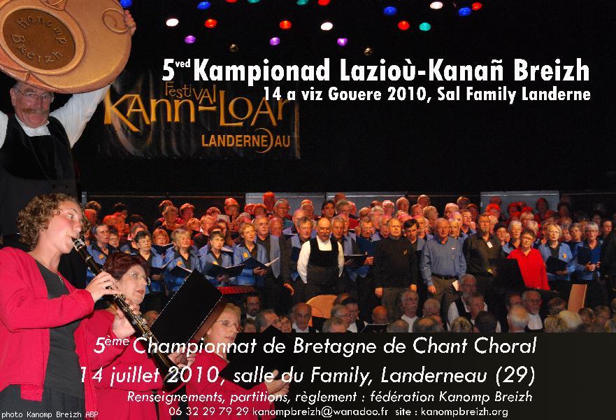 14 juillet 2010. Salle du Family, à Landerneau. 5e Championnat de Bretagne de Chant Choral d'expression bretonne, placé sous la présidence de Louise Ebrel. Les chorales de Bretagne et du monde sont invitées à venir se produire sur la scène du Family à Landerneau, dans le cadre du festival Kann al Loar, pour participer au Championnat de Bretagne. Ce concours de chant choral désigne chaque année le Champion de Bretagne des chorales ; il se déroule devant un jury composé de chefs de chœur, de musiciens, de chanteurs. Cette année, il sera présidé par Louise Ebrel, chanteuse traditionnelle de renom. Pour participer, il suffit à une chorale de pouvoir produire sur scène un programme d'une quinzaine de minutes de chant en langue bretonne, comprenant le chant imposé par la fédération. Cette année, c'est un chant traditionnel à danser qui a été choisi : Merc'h Ar Miliner. Lors de cette journée est également remis le Trophée de la Création, qui récompense une chorale qui présente une œuvre en breton écrite pour la circonstance. La chorale récompensée l'année précédente lui remet pour un an le grand trophée de bois polychrome créé par le sculpteur Jean Olivier, et qui circule de chorale en chorale au fil des créations chantées en langue bretonne. Les inscriptions sont ouvertes dès à présent et jusqu'au 10 avril 2010. Renseignements, règlement et grille de notation, partition du chant imposé :Fédération Kanomp Breizh 06 32 29 79 29