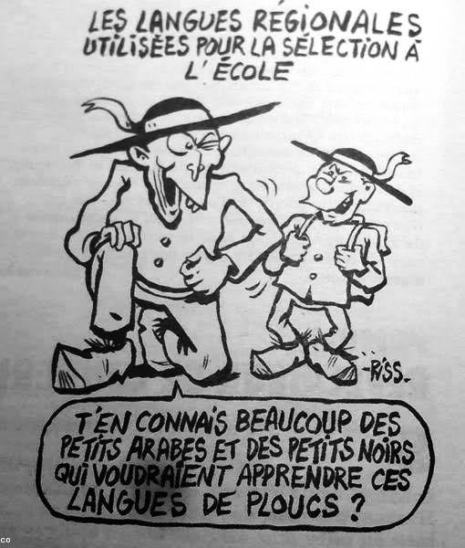 Le dessin est ignoble et rasciste. Je ne vois d'ailleurs pas pourquoi vous "justifiez" les Bretons en disant qu'ils sont descendus massivement dans la rue manifester après l'attentat. On se fait insulter, il faudrait en plus qu'on montre qu'on est de bons "français" ?! Ca suffit, ce genre de réaction, assez généralisée. Un livre de Todd est paru disant que ceux qui sont descendus manifester dans la rue en disant Je suis Charlie sont en fait des islamophobes et des rascistes ! De toute façon, avec les parigos (pas tous les parisiens, mais l'élite idéologique), les Bretons auront toujours torts, et ceux qui sont autres, ont d'autres langues, etc. Quant aux petis arabes l'école de la république ne leur offre pas beaucoup de cours d'arabe, "Trois millions de personnes le parlent en France. Pourtant, il y est peu ou mal enseigné. Par manque de volonté politique, par crainte du communautarisme. Quitte à abandonner le terrain aux associations religieuses."
