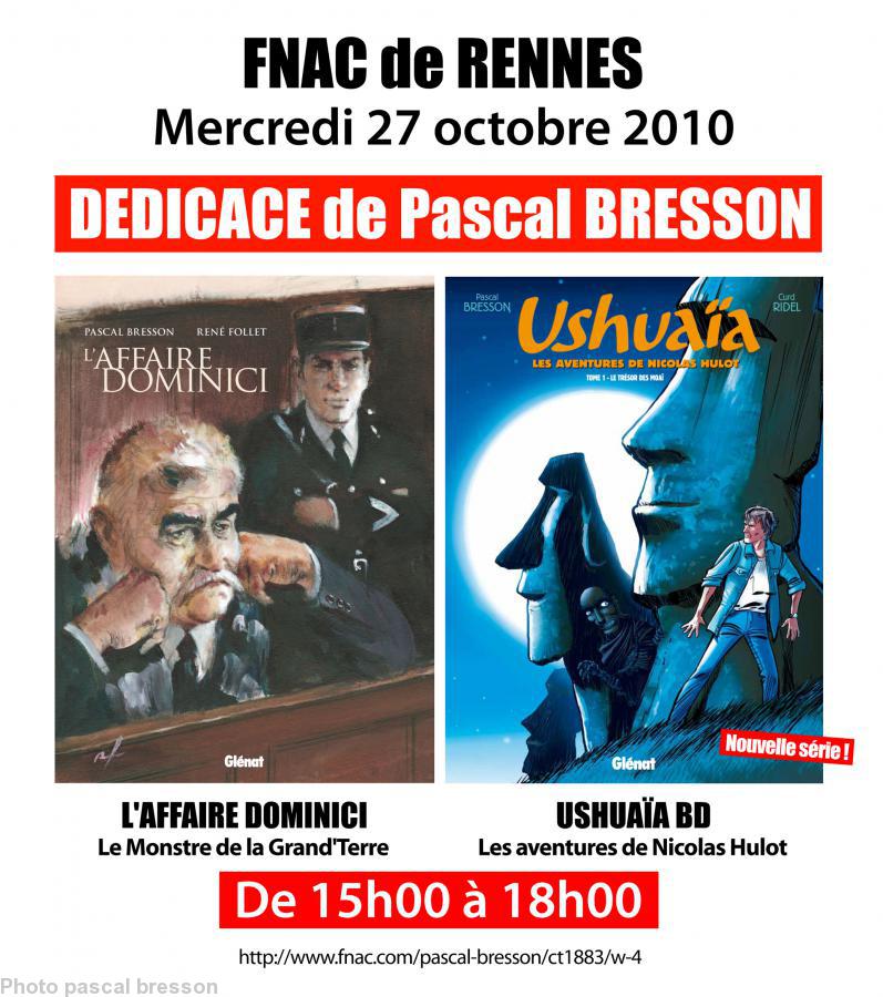 Pascal Bresson dédicacera ses deux dernières bandes dessinées – parues aux éditions Glénat – à la Fnac de Rennes le mercredi 27 octobre de 15 à 18 heures. http://www.fnac.com/pascal-bresson/ct1883/w-4 de la Fnac.