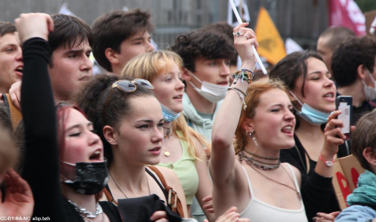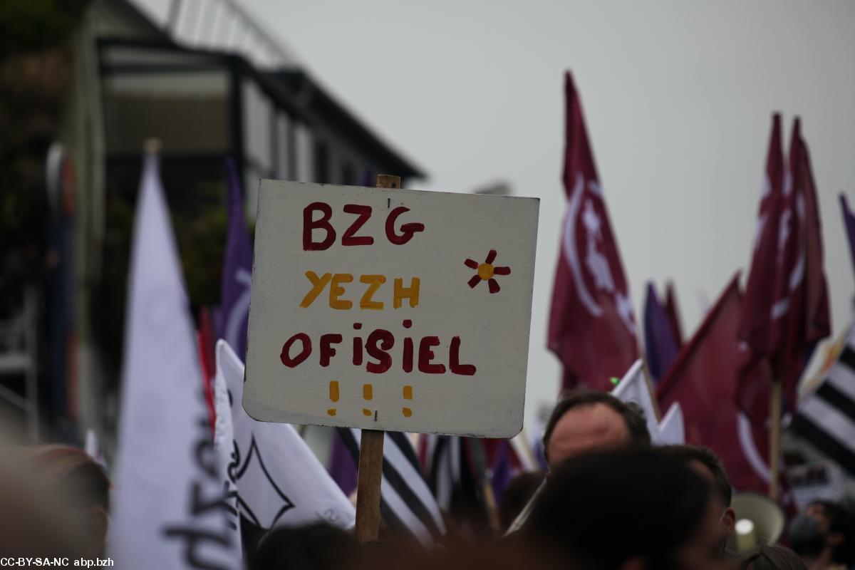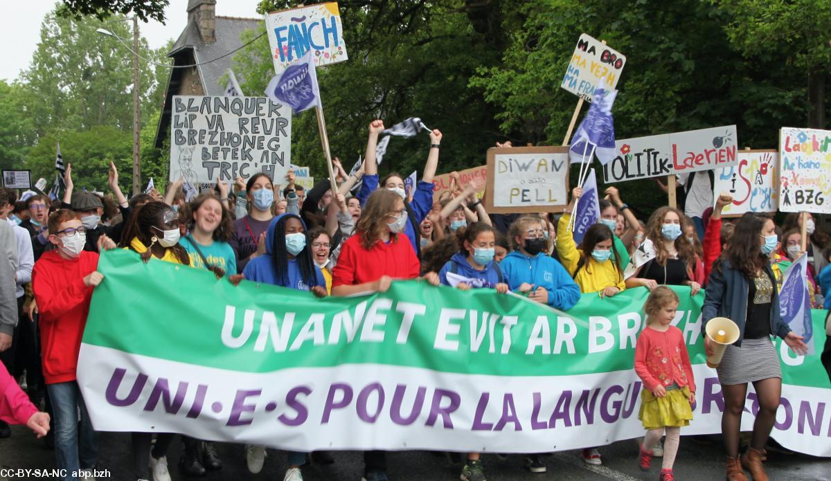 Parmi les 10 000 manifestants, une jeunesse bretonnante tumultueuse et bien consciente du danger que court la langue de leurs ancêtres a défilé sous bannières, gwenn-ha-du et pancartes en scandant à tue-tête Brezhoneg yezh ofisiel.
