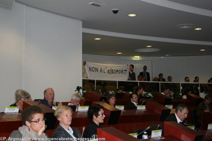 Jeudi 21, alors que s'ouvrait une nouvelle session du Conseil régional de la Bretagne administrative, des militants anti-aéroport tenaient une banderole à l'intérieur de l'hémicycle tandis que d'autres piquetaient à l'entrée de l'Hôtel de Région à Rennes.