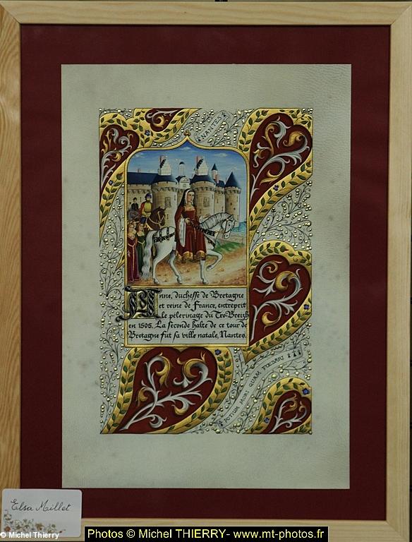 organisé par les P'tits frères de Bacchus, Loisirs et Culture et Hentoù Breizh (Chemins de Bretagne). Son enluminure a été réalisée sur du papier chiffon. Le titre de son oeuvre est La Bretagne accueille Anne à Ancenis. On y voit une hermine en fourrure d'été (donc brune). La scène se passe en effet en juin. Le texte est une partie du texte gravé sur le Reliquaire ayant conservé son coeur, actuellement au musée Dobrée (pour la vie résumée de Anne de BretagneAussi sur ABP…