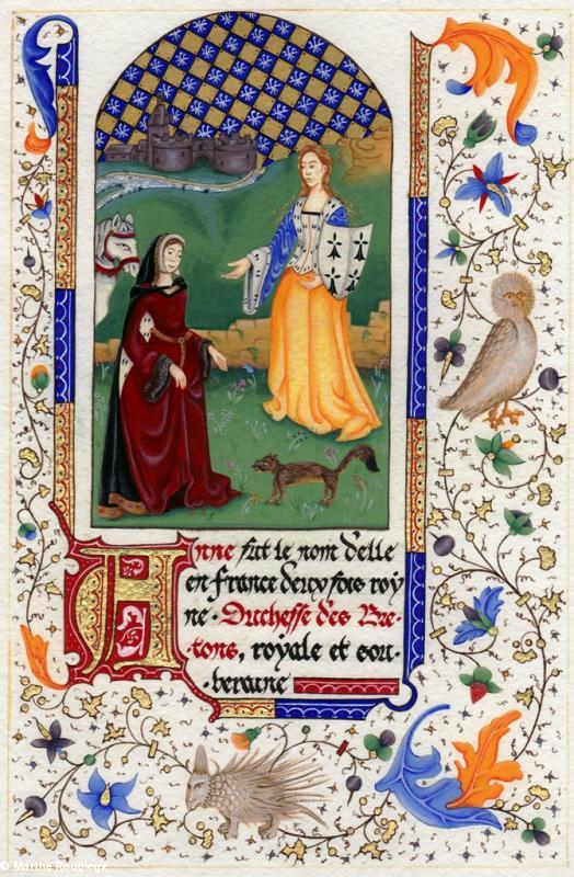 ), reliquaire qui sera bientôt exposé à Blois puis à Nantes ce printemps, et enfin à Châteaubriant tout l'été. Notez bien la subtilité : les mots Duchesse des Bretons sont rubriqués (en rouge) pour montrer la prééminence de ce rôle par rapport à deux fois royne [de France]. Derrière Anne on aperçoit Châtillonne, sa jument, comme si Anne venait de mettre pied à terre. En bas, le porc-épic, symbole de Louis XII.Aussi sur ABP…500e anniversaire de la mort d'Anne de Bretagne, dernière souveraine du duché indépendant