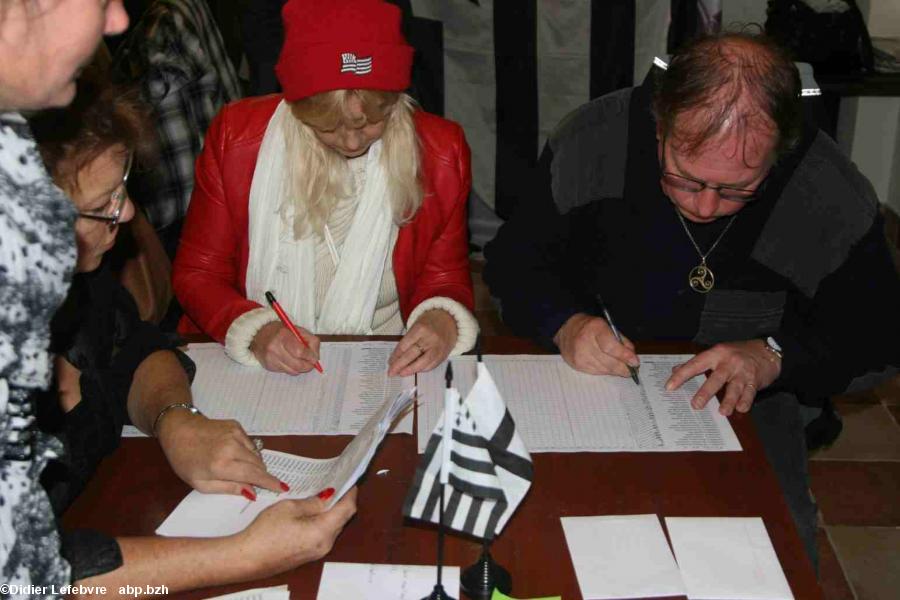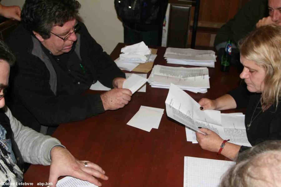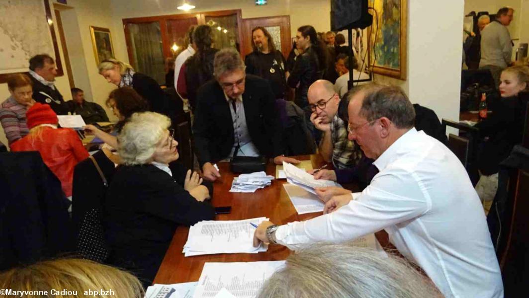 Revenons au début. Au début, il n’y avait rien. Si, un Parlement, mais en sommeil depuis 1788. Dans le rôle du prince charmant, pour le réveiller, Yann-Vleiz Ar C’hunff, et ses dames Odile et Antoinette. D’une assiduité constante, toutes les tâches nombreuses de secrétariat, elles les ont assurées ! Jusqu’à la dernière minute. Discrètes, assidues, les grandes sont aussi des taiseuses. Et notre Yann-Vleiz ? Il joue son rôle d’hôte avec admiration. Accueillant tous les électeurs, discutant avec l’une, évoquant des souvenirs avec un autre. Près de cinq ans qu’ils y travaillent, à ce réveil du Parlement. L’association naquit après la manifestation Deomp de’i (Allons-y) de mars 2012 à Kemper : http://www.letelegramme.fr/local/finistere-sud/quimper/ville/quimper-mode-d-emploi-de-la-manifestation-deomp-de-i-ce-samedi-29-03-2012-1650417.php . Presque cinq ans de boulot, de chausse-trapes à éviter. Du temps, de l’énergie. Des réunions publiques durant six mois. Treize, il y en eut 13 au total. Et le bébé arrive. Le Parlement de Bretagne http://www.parlementdebretagne.org/category/actualites-parlement-de-bretagne/ renaît (tiens, comme Renée, l’héritière du duché, spoliée par son beau-frère François, enfant gâté de Louise de Savoie, laquelle manigança pour en faire un roi bien pleutre et pitoyable, d’ailleurs, mais surtout voleur de duché).Aussi sur ABP…Le réveil du Parlement de Bretagne : c'est pour la fin de l'année