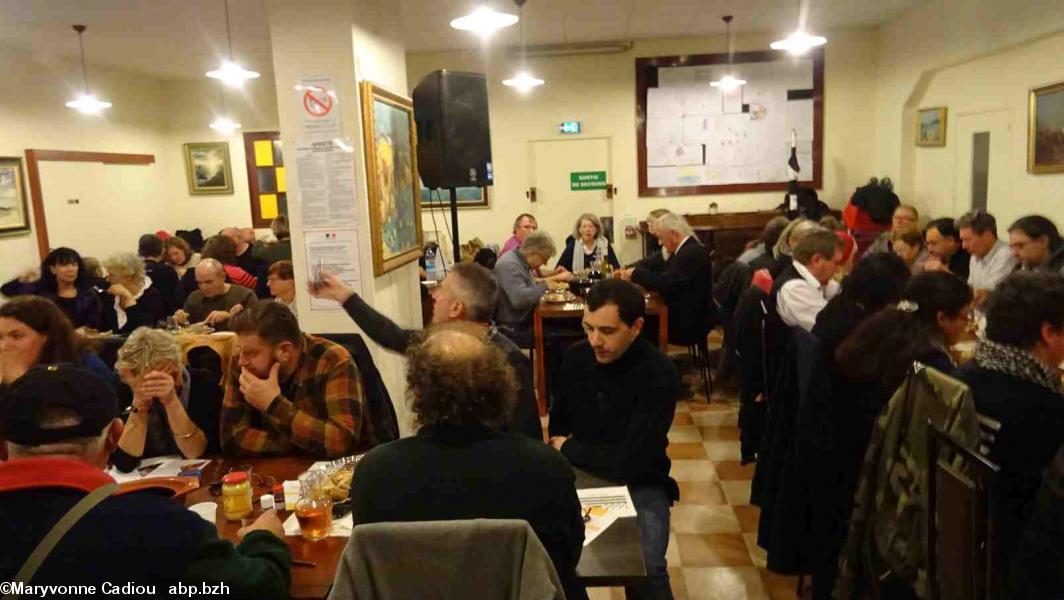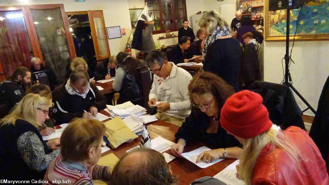 Tout l’après-midi les gens vont, viennent, votent, boivent (avec modération), rigolent, chantent, dansent. Oui, on est bien en Bretagne (pas loin de là, il y avait des élections dont on a parlé plus dans la presse ; gageons que les bureaux furent plus tristes). Au plus fort, on a dénombré jusqu'à 120 personnes. Certains sont venus du Léon, d’autres du Vignoble nantais, il en est certains venus de Mayenne, et d’autres de Paris. Tout exprès. Quel plaisir de rencontrer Marine Jaouen et Yann-Varc’h Naoufel Furon de Ambasad Vreizh https://ambasadvreizh.wordpress.com/ Lequel Yann-Varc’h était candidat, d’ailleurs, pour la diaspora. Tous les électeurs ne pouvaient pas venir. Un vote par courrier postal avait été autorisé. Ceux-là qui l’ont fait ont oeuvré pour la bonne cause, mais ils ont raté, hélas pour eux, cette splendide journée.Dix-huit heures, fin du vote, début des opérations de dépouillement. La concentration l’emporte peu à peu sur l’euphorie. La bonne humeur ne quittera néanmoins jamais les convives du Menhir Black (voir plus loin). On organise les tables, on pointe les listes électorales, on valide les votes par correspondance. Et on commence le dépouillement. Il fut long, ce dépouillement, citer les noms rayés, les pas rayés, vérifier. Dans les règles de l’art, avec quatre scrutateurs à chaque table. Et les électeurs qui vérifient la validité des opérations. Il faut compter, recompter, vérifier. À la fin, Yann-Vleiz prend la parole. Tout ému, mais aussi impressionné par la réussite de cette opération, mais surtout par son engouement, et par l’avenir qui s’annonce pour le Parlement. Oui, il a réussi, mais le travail ne fait que commencer pour ce Parlement. Les contraintes techniques ont empêché ABP de filmer cette prise de parole, en voici quelques mots. Ils méritent d’être médités. "Nous sommes une alternative à la violence", "ce que l’on veut pour la Bretagne, on le veut pour la terre entière, pour toutes les nations. Le temps des États tortionnaires, mafieux, pollueurs est fini".