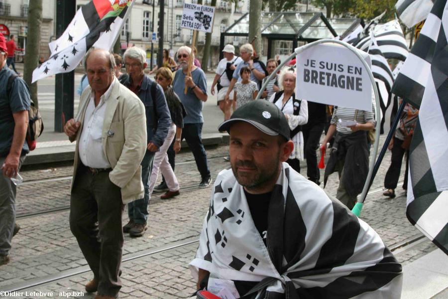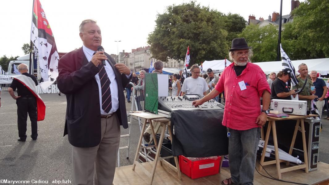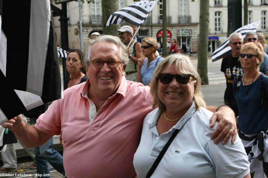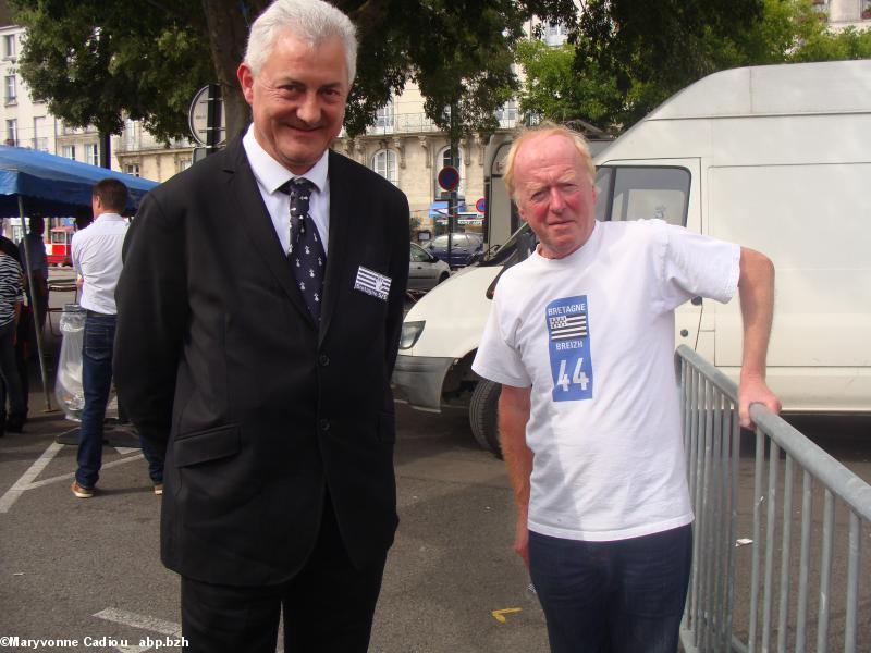 - Breizh Manif 2016. Deux membres de Bretagne Réunie Nantes. Yves très chic pour défiler avec son drapeau gigantesque, François en tenue plus simple, sur le pont depuis 7 h au montage !