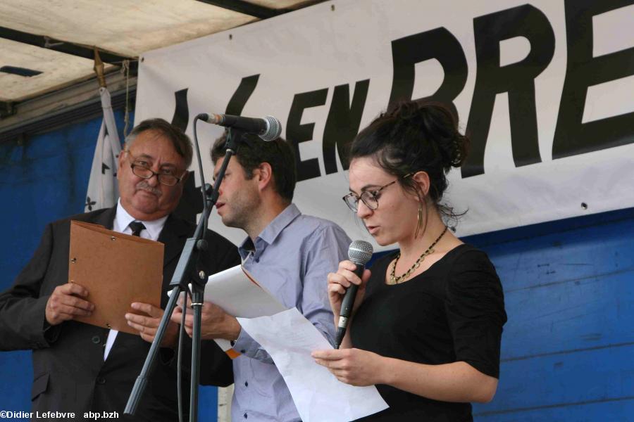 - Breizh Manif 2016. Vers 13 h-14 h. En t-shirt gwenn ha du rayé, cheveux courts, Anne-Édith Poilvet de feu Armor magazine et du site Construire la Bretagne.