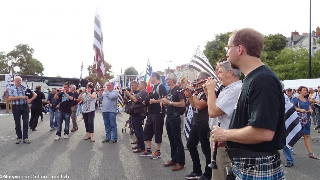- La Breizh Manif 2016 : Ah bon, Nantes ne serait pas en Bretagne ? Des membres du Bagad d'Orvault.