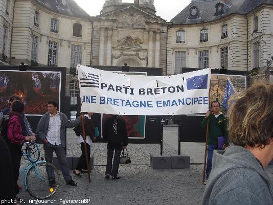 Environ 200 personnes dont un candidat aux élections municipales du Parti Breton, ont manifesté ce soir à Rennes contre la venue de Nicolas Sarkozy en Bretagne a l'appel de différentes organisations comme Emgann, le SLB et le Parti Breton. Des membres du modem 35 étaient aussi présents. Partis de la place de la mairie, les manifestants se sont dirigés vers le siège de l'UMP.