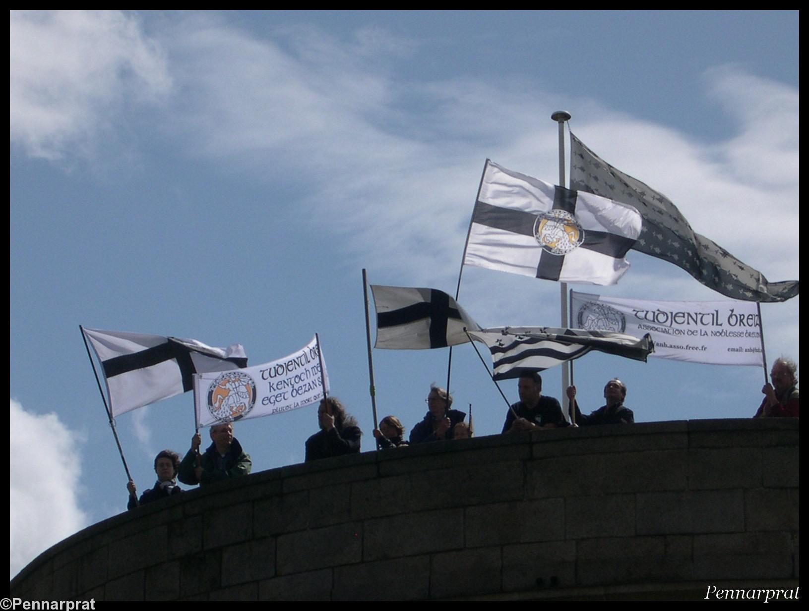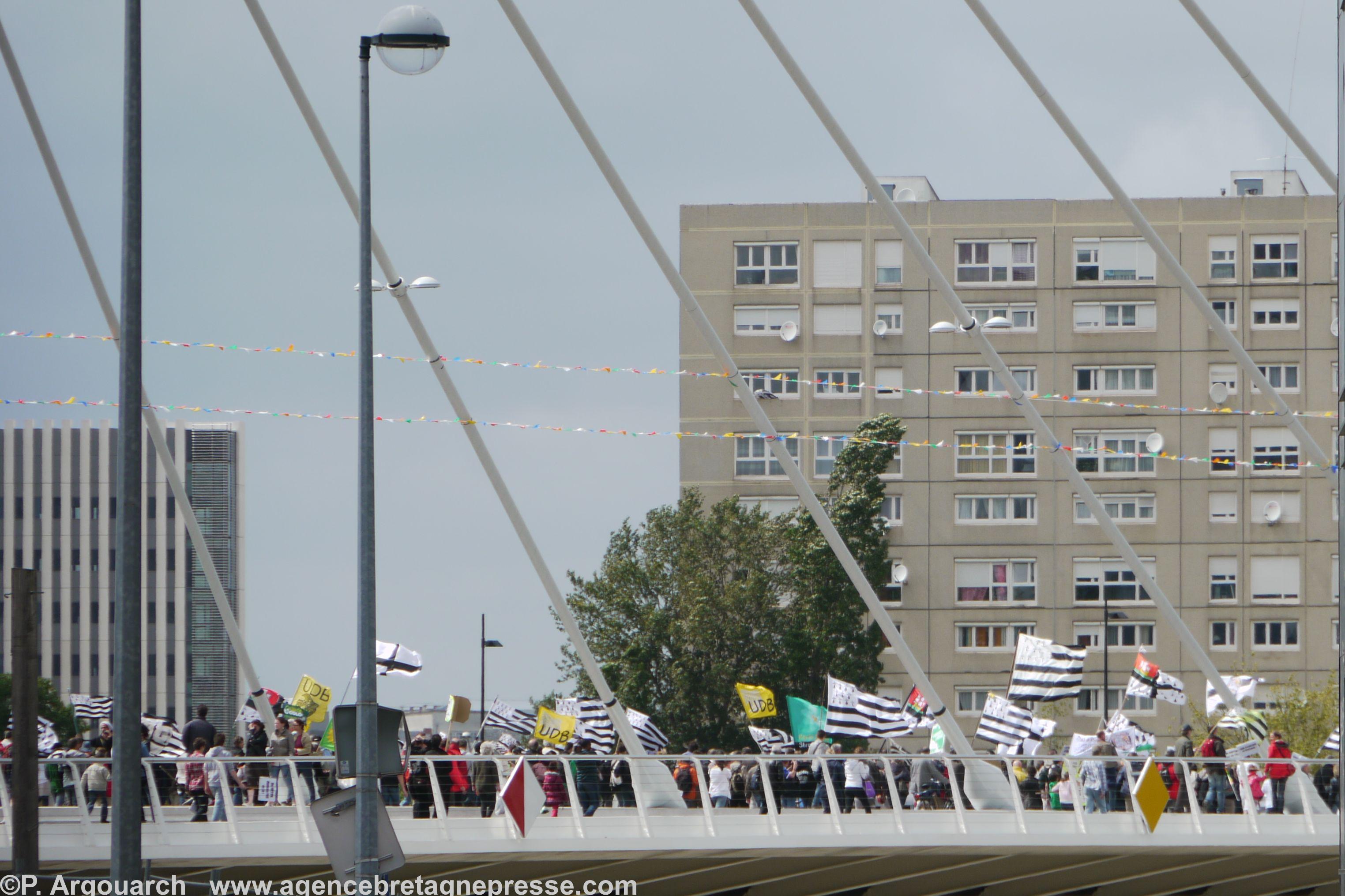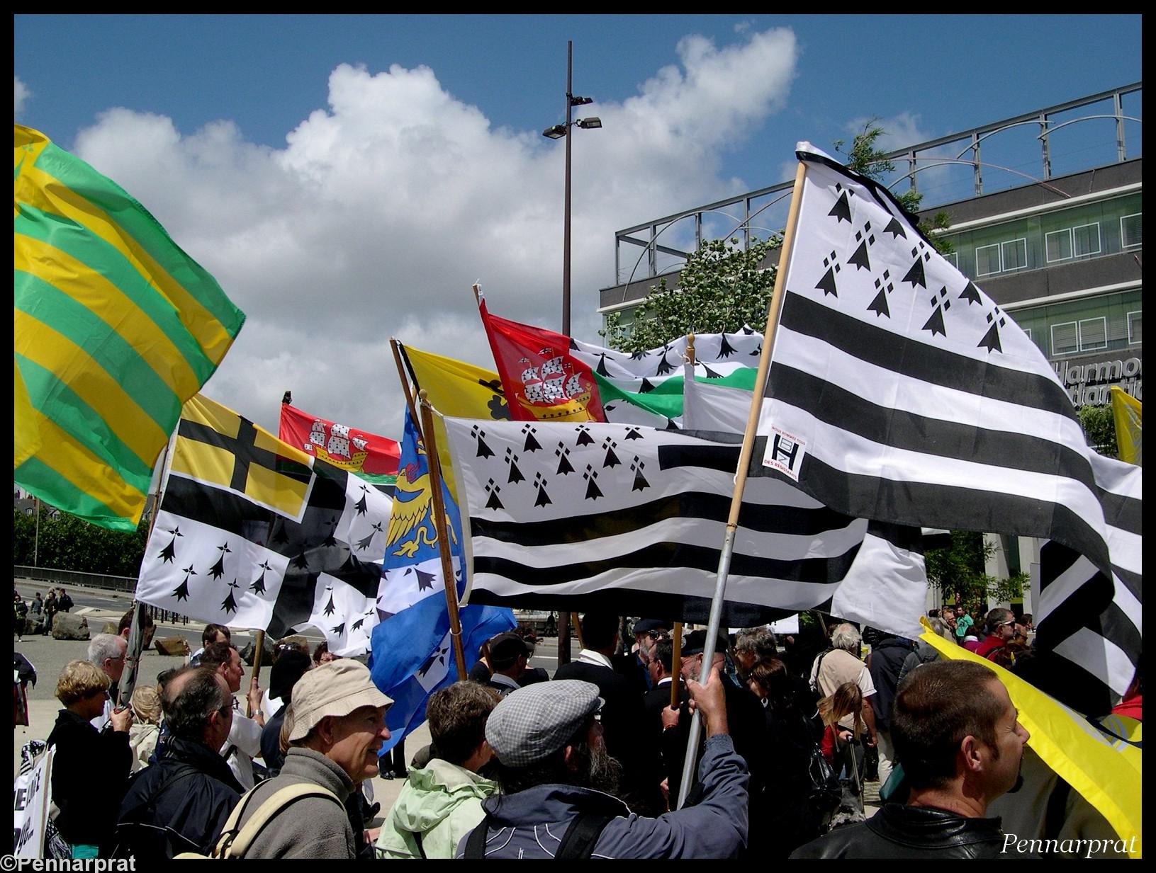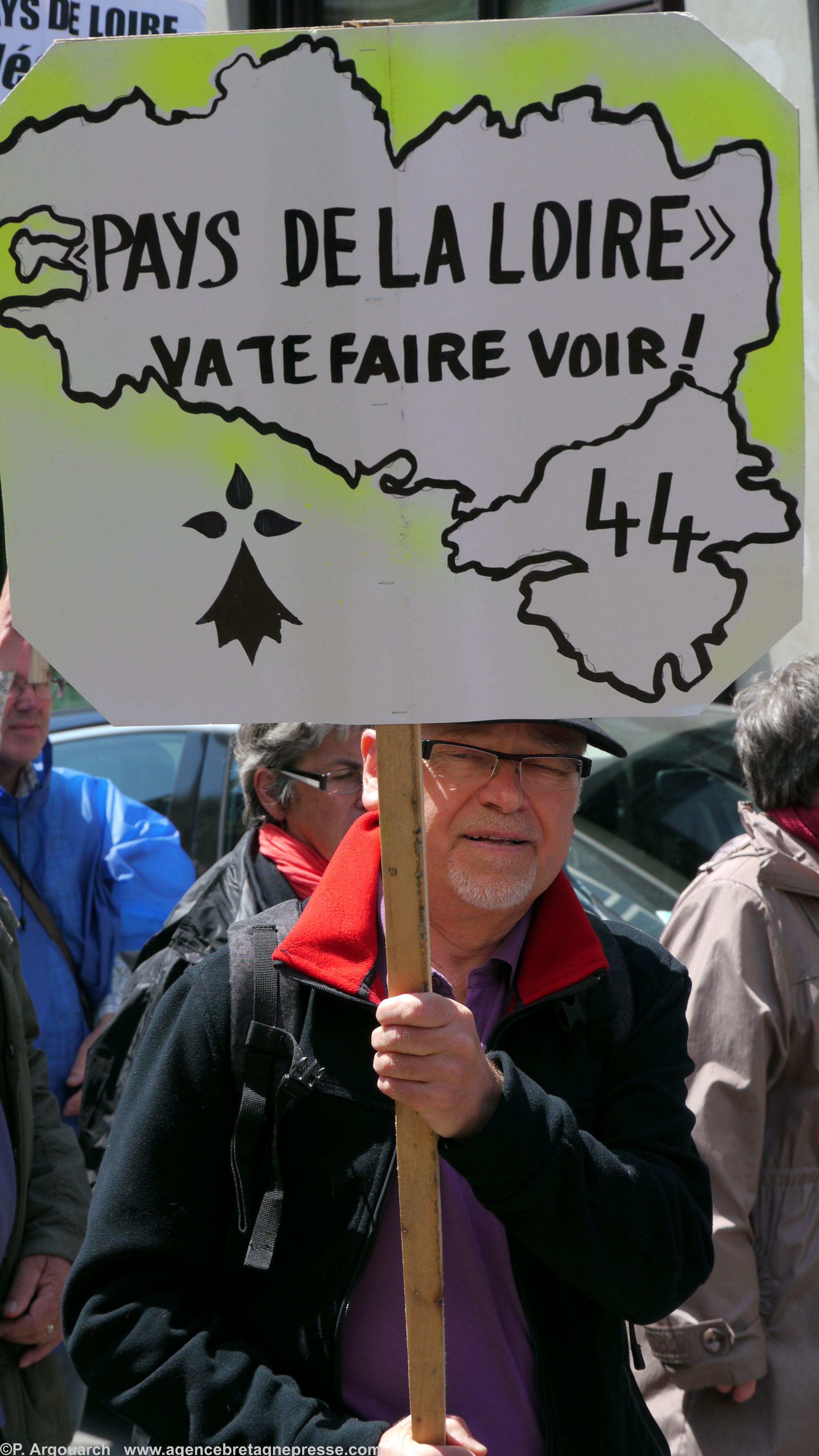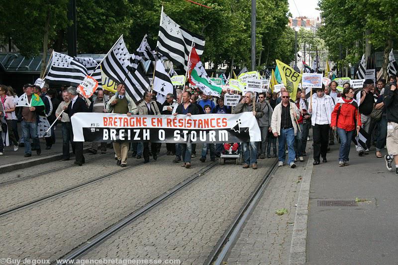 Vichy c'est fini". Vichy en référence à une première division de la Bretagne historique en 1941 lorsque le maréchal Pétain avait créé les super-préfectures. Les partisans du retour à la Bretagne historiqu, venus des 5 départements, ont défilé sur sept kilomètres passant par l'Hôtel de Région des Pays de la Loire et le château des Ducs de Bretagne. Deux étapes symboliques où le Bro Gozh, l'hymne national breton, fut chanté avec ferveur et ponctué de pétards.