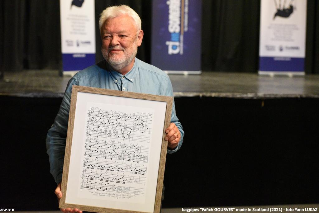 . Fañch Gourvès, discrètement assis dans le public et à qui fut remis, par Yann Peillet de Ti ar Sonerien, un tableau représentant une partition musicale.