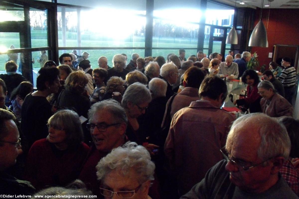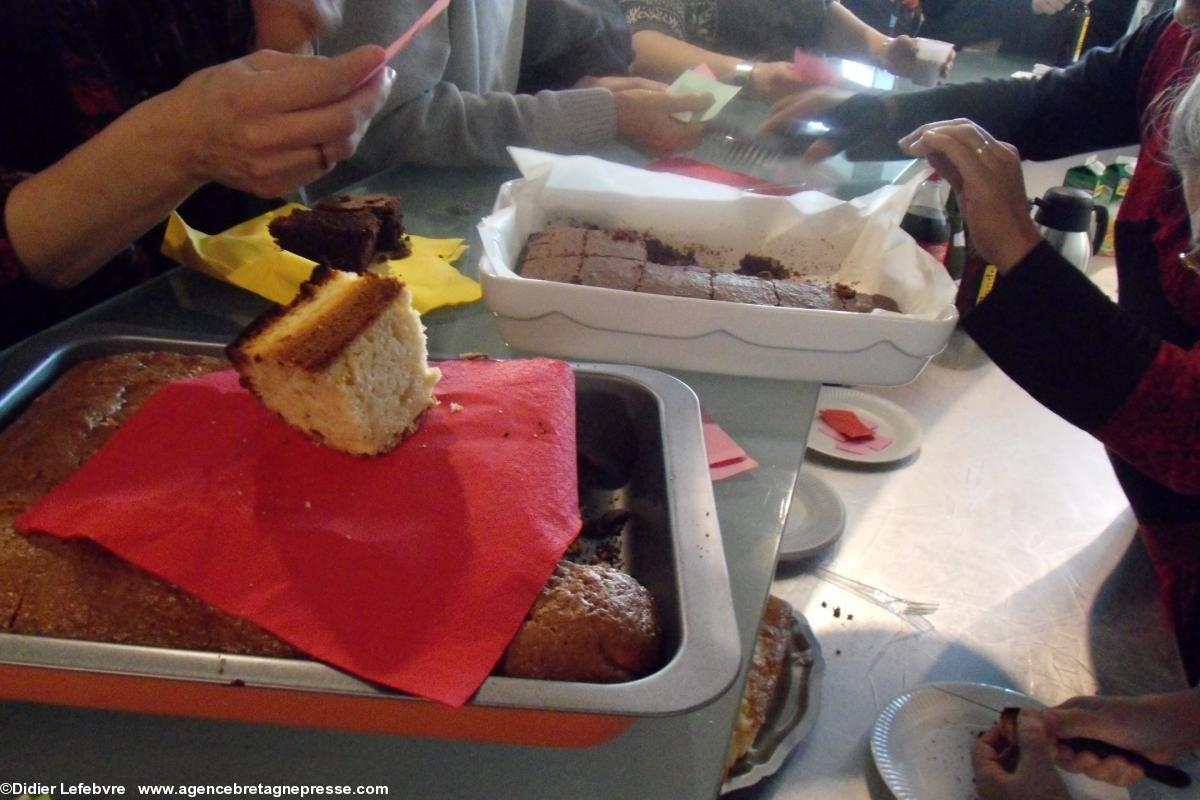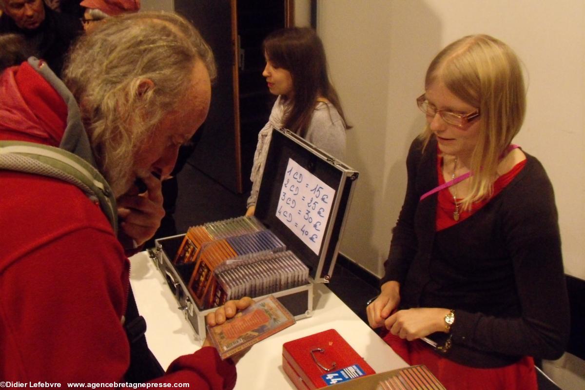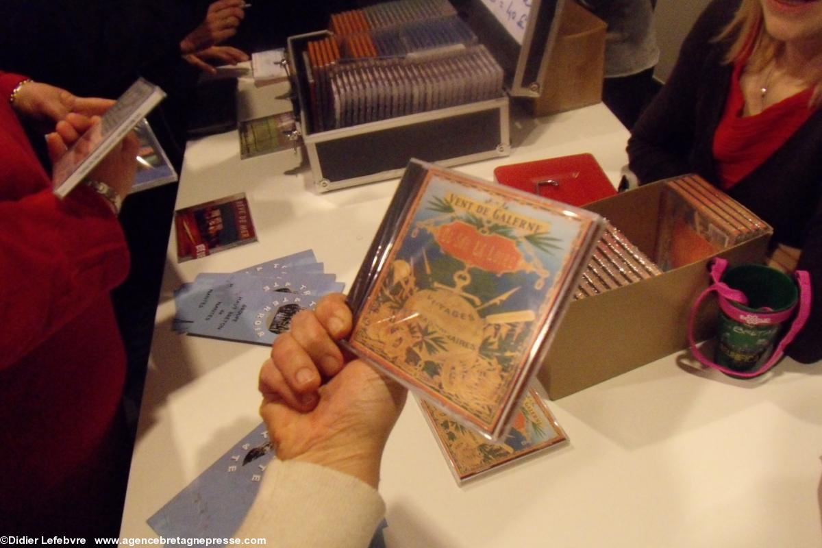 Arrive l'entracte, où la public a peine à se frayer un chemin pour aller déguster les gâteaux préparés par Tréteau & terroir, et aussi pour aller acheter des CD. Écoutons Gérard, grand fan de chants de marins (5) : « J'adore acheter mes CD dans de telles ambiances, c'est quand même différent de l'anonymat de la grande distribution. Les groupes ont besoin de soutien. En plus, ce n'est pas cher. Ce CD » (il nous montre celui de Vent de Galerne) « je l'ai acheté en double. Je trouverai bien à qui l'offrir ». Maëv' (le prénom a été changé) offre son sourire à tous ceux qui se pressent à son stand, pour acheter des CD. « Oui, les ventes sont bonnes. J'en vend plus qu'à la Nuit bretonne d'hier soir », se réjouit-elle. « Vraiment, l'ambiance est chaleureuse ». Au bar, les différents gâteaux sont tous plus appétissants les uns que les autres. Armelle et ses amies les proposent avec sourire, nous rappelant, si il en était besoin, qu'ils ont été préparé avec... amour.