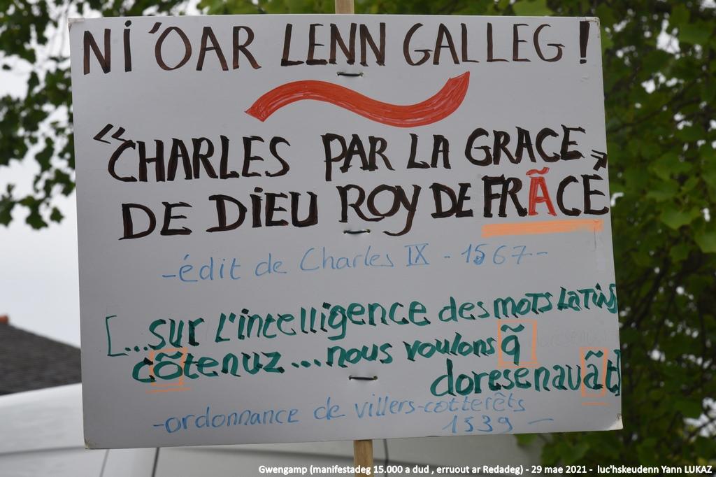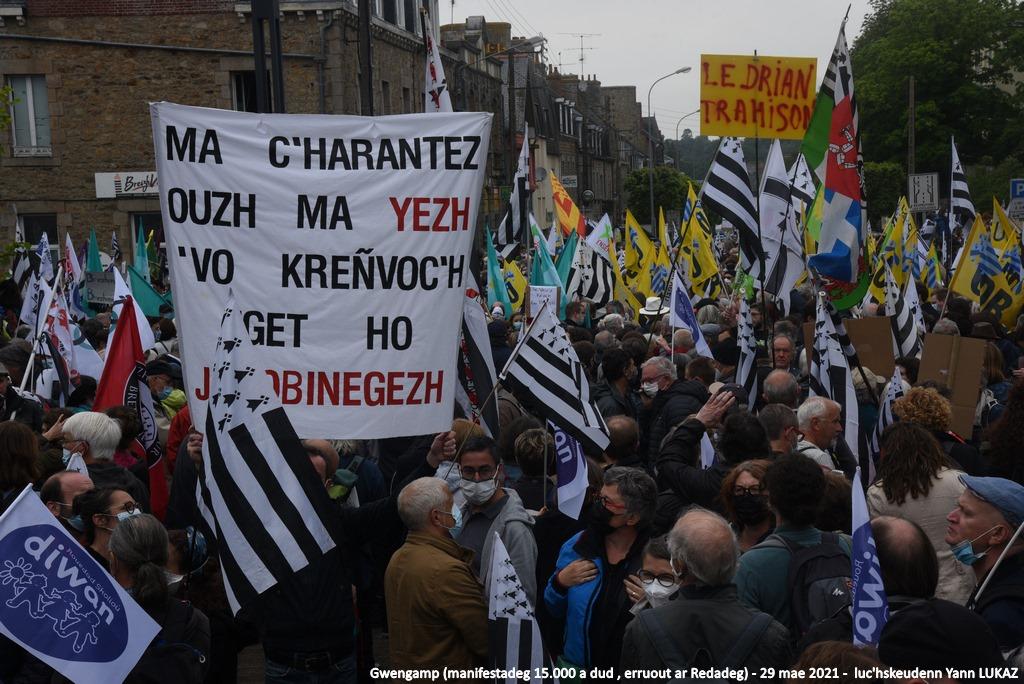 - Gwengamp, 29 mae 2021. manifestadeg evit ar yezh. Redadeg 2021. Départ de la manif à travers la ville, depuis la gare de Guingamp (la Redadeg n'est pas encore arrivée). Skritell: "Ma c'harantez ouzh ma yezh 'vo krenvoc'h eget ho jakobinerezh". Hag ivez ur skritell all a c'hellfer he lakaat e saozneg brav: "Le Drian, help!" pe e brezhoneg:" Deoc'h-c'hwi, Breizhad ha politikour dornet mat hag a skiant-prennet, da vont e-barzh ar jeu!"