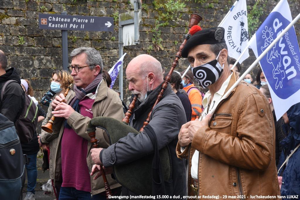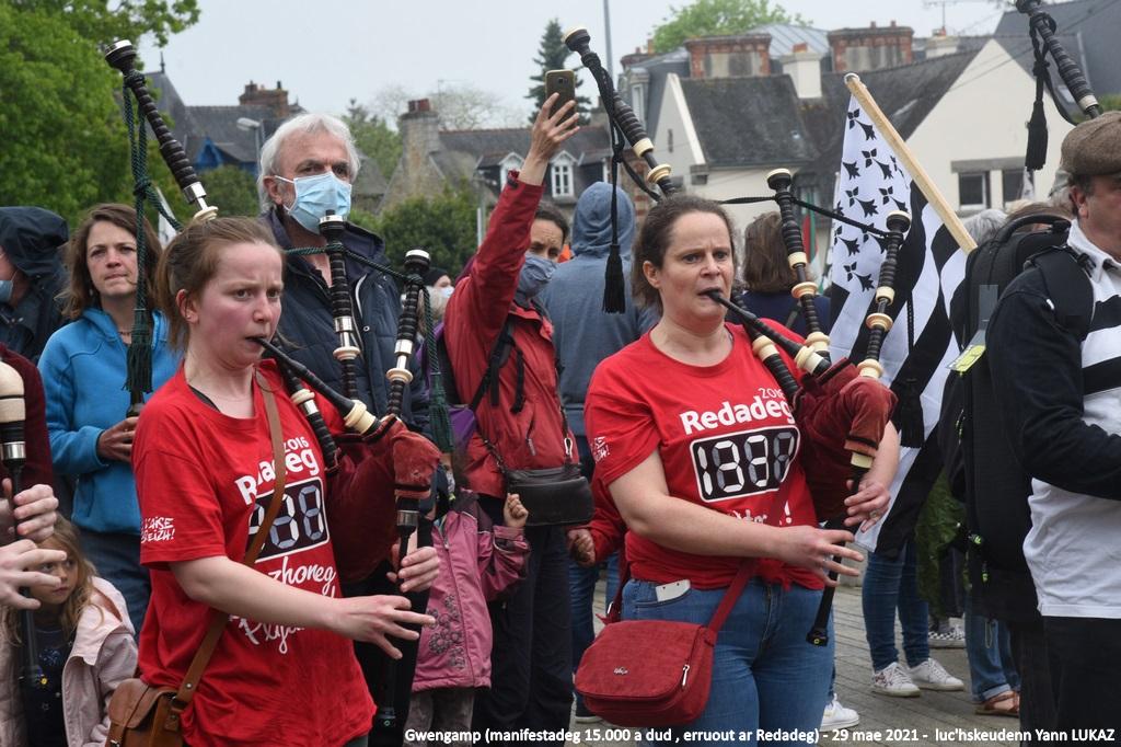 - Gwengamp, 29 mae 2021. manifestadeg evit ar yezh. Redadeg 2021. Sonerezh hengounel (dre ar binioù braz): ar maouezed ivez. Musique bretonne (cornemuse ou bagpipe): jeunes femmes en action.