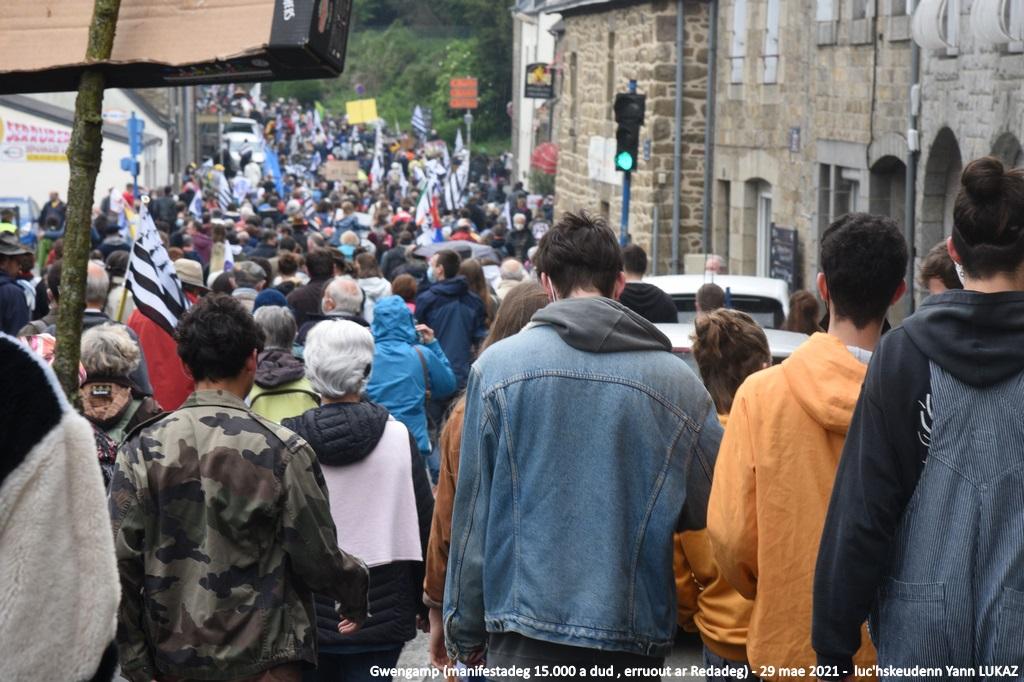 - Gwengamp, 29 mae 2021. manifestadeg evit ar yezh. Redadeg 2021. Long défilé durant une large partie de l'après-midi, dans les rues étroites de Guingamp. Hir ha padus eo an dibunadeg e straejoù treut a-wechoù eus Gwengamp.