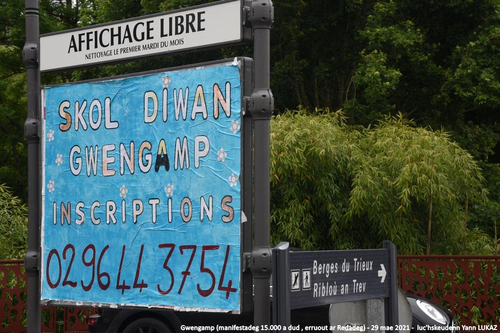 - Gwengamp, 29 mae 2021. manifestadeg evit ar yezh. Redadeg 2021. Skol Diwan Gwengamp ha panelloù divyezhek: "Affichage libre" = "Skritellañ dieub", bremaik?