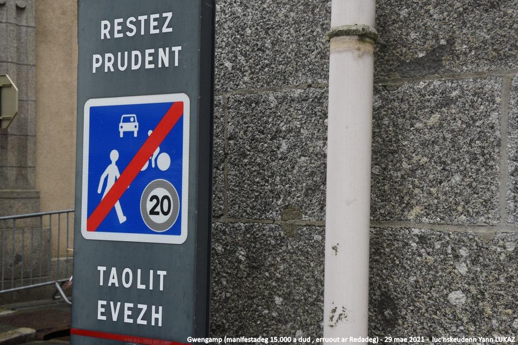 - Gwengamp, 29 mae 2021. manifestadeg evit ar yezh. Redadeg 2021. Exemple de signalétique bilingue, banale, quotidienne. Il est où le danger linguistique ? Hag un tamm a zañjer dre ar yezhoù a vefe? Ar c'hontrol eo a c'hellfe bezañ: sachañ a ra an evezh ar banell zivyezhek.