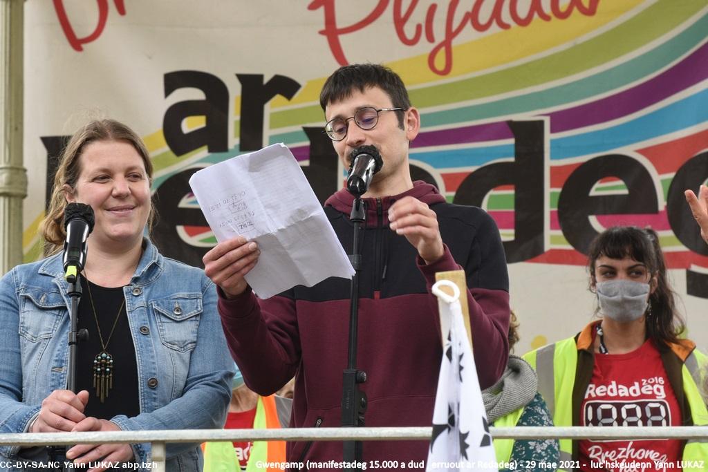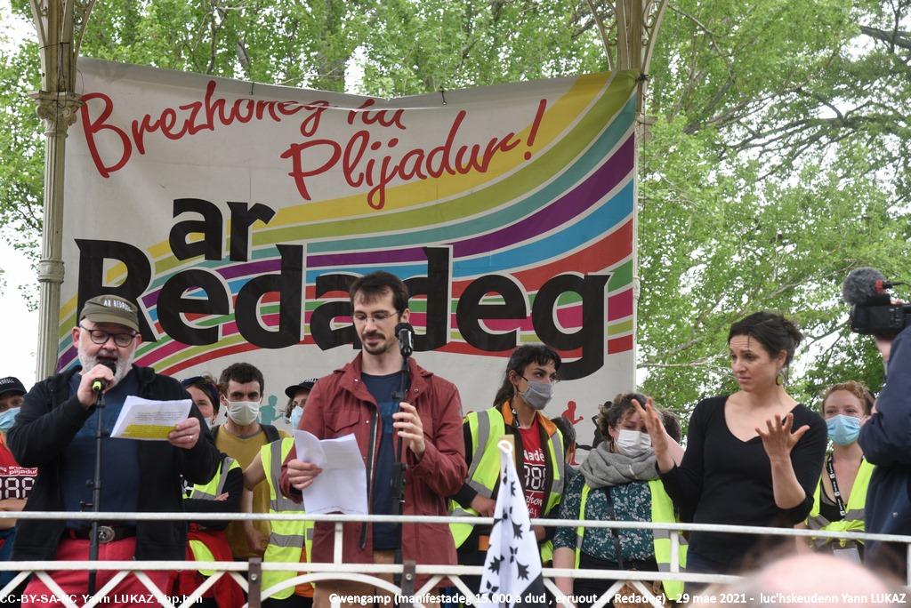 - Gwengamp, 29 mae 2021. manifestadeg evit ar yezh. Redadeg 2021. Kiosque d'arrivée de la Redadeg, à Guingamp. Prise de parole en breton (traduction simultanée en langage de signes, à droite) et alternativement en français. Teir yezh: brezhoneg, galleg, ha langach ar sinoù.