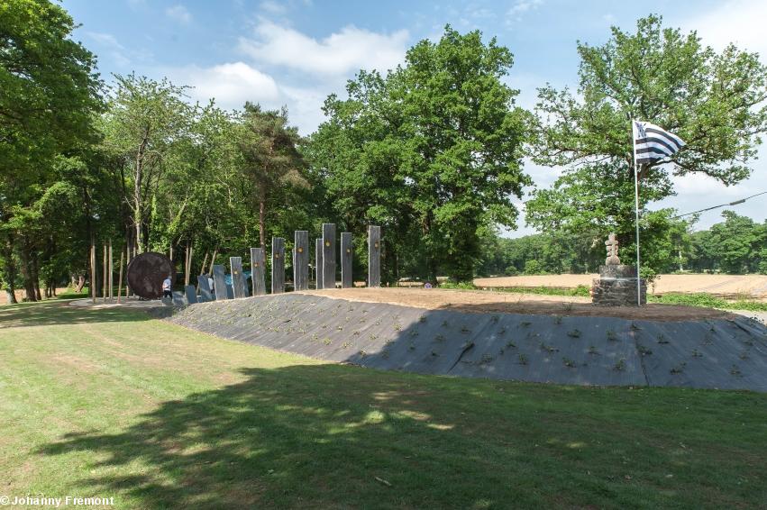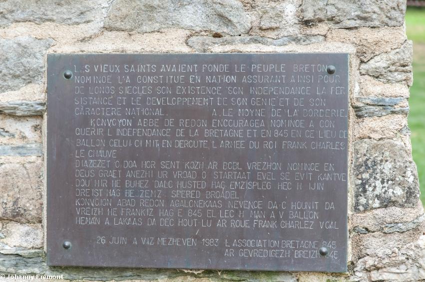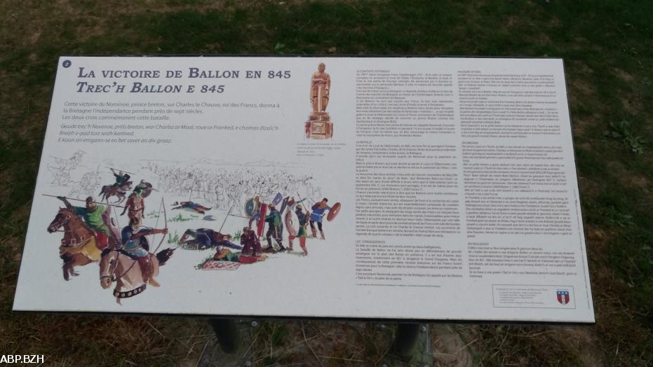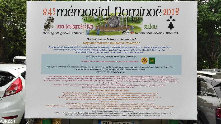 Grand pari pour l'association Poellgor Nominoe, à l'origine de la création de ce mémorial, original dans sa forme et ses volumes, où Nominoë et ses lances dominent l'armée franque de Charles le Chauve. Voir différentes vidéos : https://www.youtube.com/watch?v=_EZpB8tShb4 https://www.helloasso.com/associations/comite-pour-la-fete-de-la-victoire-de-ballon-poellgor-gouel-ballon/collectes/bretagne-845-memorial-nominoe et le compte Facebook du Comité : https://www.facebook.com/poellgorgouelballon/