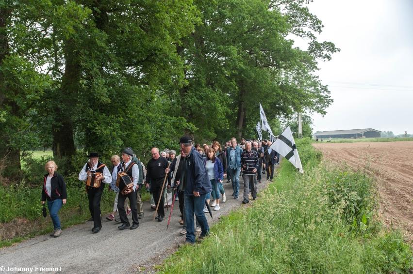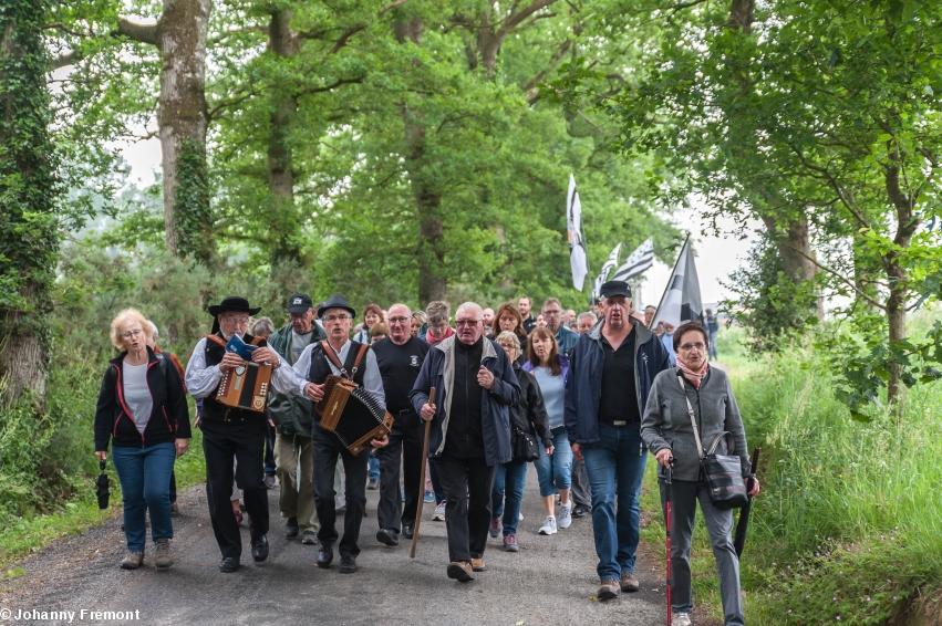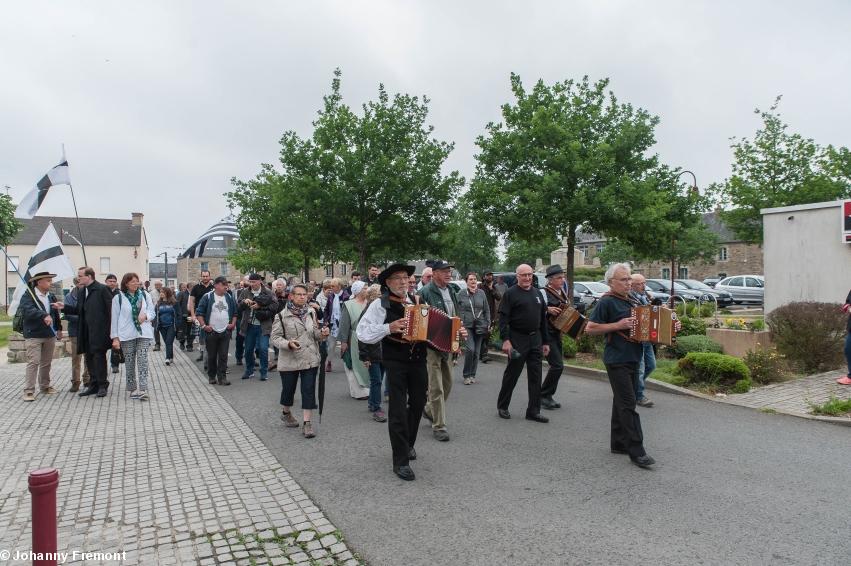 Le point de rendez-vous était sur la place Nominoë, devant la statue, et les convives ont déambulé jusqu'au site, en groupe et en musique. Deux calèches étaient là pour les personnes à mobilité plus réduite.