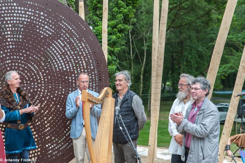 Entre ces discours, l'association remercia les donateurs, associations ou particuliers, et bien entendu l'artiste redonnais Jean-Pierre Bauduhttps://bretagne845.wordpress.com/2018/04/11/bataille-gagnee-pour-le-memorial-nominoe/ , la harpe si fluide de Myrdhin https://www.myrdhin.net/ nous envo^ùta, et la cérémonie se conclut avec la merveilleuse Klaris Lavanant chantant le Kan Bale Nevenoe de Glenmor https://www.youtube.com/watch?v=EwjbFeLieMo , puis le Bro Gozh ma Zadoù, devant les personnalités présentes, et les Herminés invités à se joindre à elles