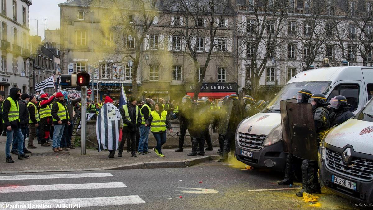 Des violences ont éclaté ce samedi entre des gilets jaunes au nombre de 400 ou 500 et les forces de l’ordre dans le centre de Quimper. Devant la préfecture, les CRS