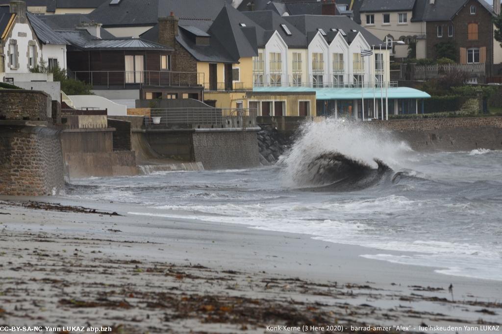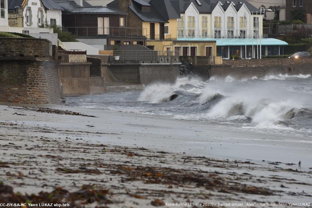 - Konk-Kerne, gwener da noz (02 Here 2020). La voiture est masquée par les embruns. Des panneaux disposés à intervalle indiquent un "risque de submersion possible" pour la chaussée.