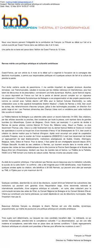 Le directeur du TNB (Théâtre national de Bretagne), François Le Pillouër, a envoyé un mail aux 14 000 abonnés du théâtre pour vanter les mérites de la politique culturelle de la mairie socialiste.