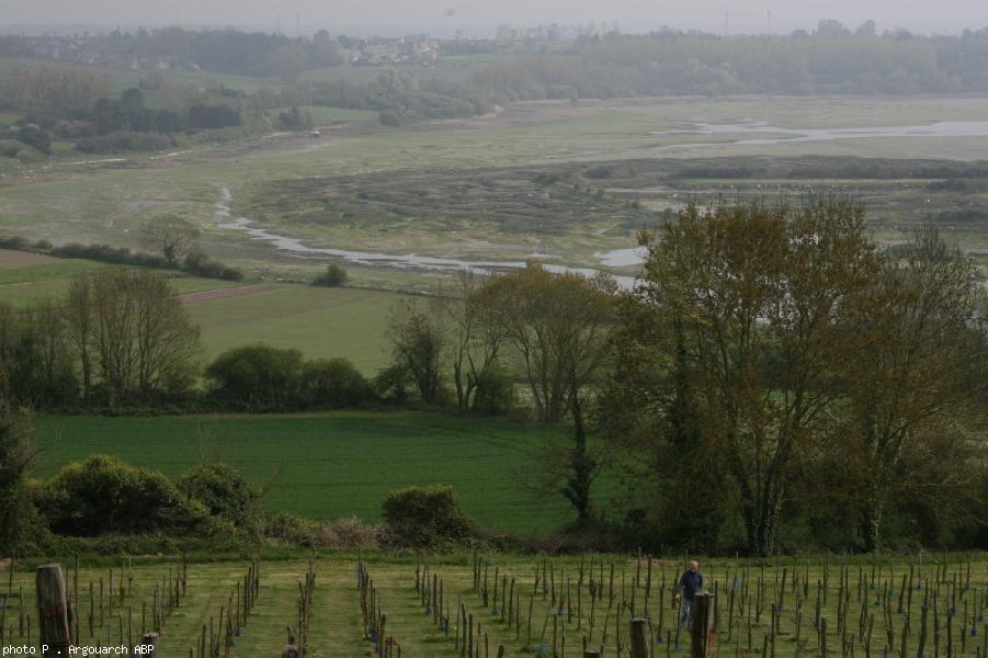 - Le vignoble de Saint-Sulliac avec en arrière plan l'ancien port viking de la Rance