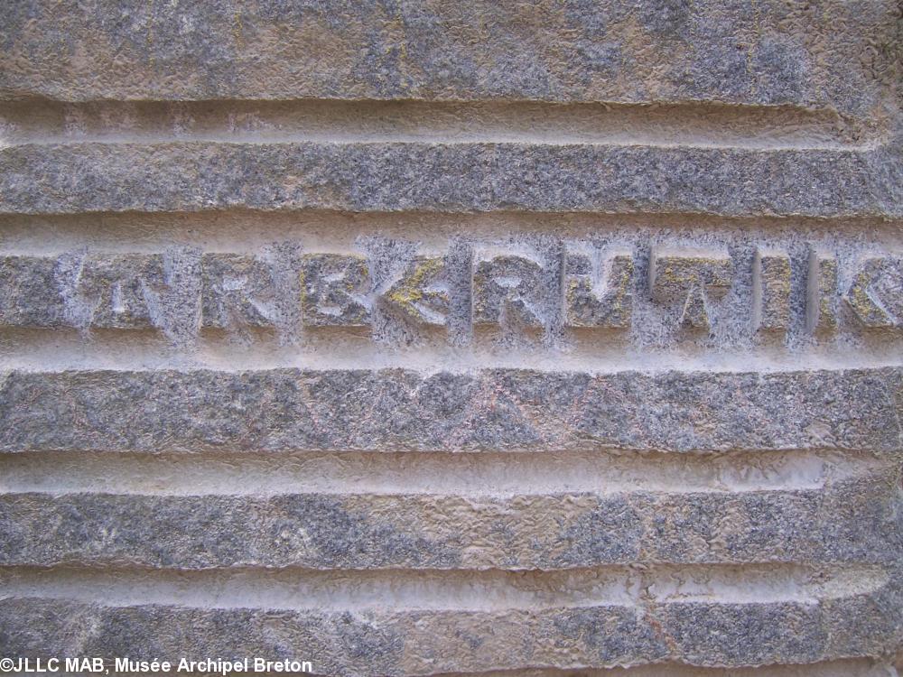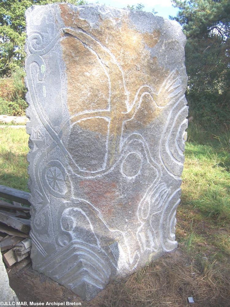 Il a enfin choisi une pierre, dans le cromlec\'h au nord du terrain de Koad sav Pell, et en fonction de sa forme et de sa matière, de sa texture et de ses différentes tonalités, une idée lui est venue qu\'il a dessinée, puis gravée en bas relief… Il a obtenu ainsi une sculpture-gravure onirique tout en finesse et suggestion, qui respecte la pierre, son volume et ses textures. On y voit différents personnages, astres, outils, dans une danse poétique faussement naïve, qui n\'est pas sans rappeler les anciennes cultures qui nous ont précédées…