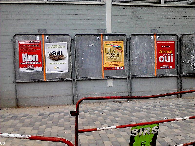 Mais pour le PS c\'est plus compliqué : le PS du Haut-Rhin appelle à voter OUI, alors que le PS du Bas-Rhin se partage entre le NON et l\'abstention. Sur les panneaux officiels devant les bureaux de votes, il y aura donc deux affiches distinctes pour le PS. Celle du \"PS 68 et élus indépendants – Alsace\" qui appelle à voter OUI) et celle de l\'\"Intergroupe élus socialistes et républicains d\'Alsace\"– pour qui c\'est NON ou l\'abstention. La division géographique ne fait que refléter une division idéologique bien plus profonde entre les socialistes jacobins et les partisans de régions fortes et simplifiées plus adaptées à l\'Europe. Elle semble suivre les lignes de la division qui existe de longue date sur l\'Europe et qui s\'est manifestée par exemple lors du referendum sur le traité européen.